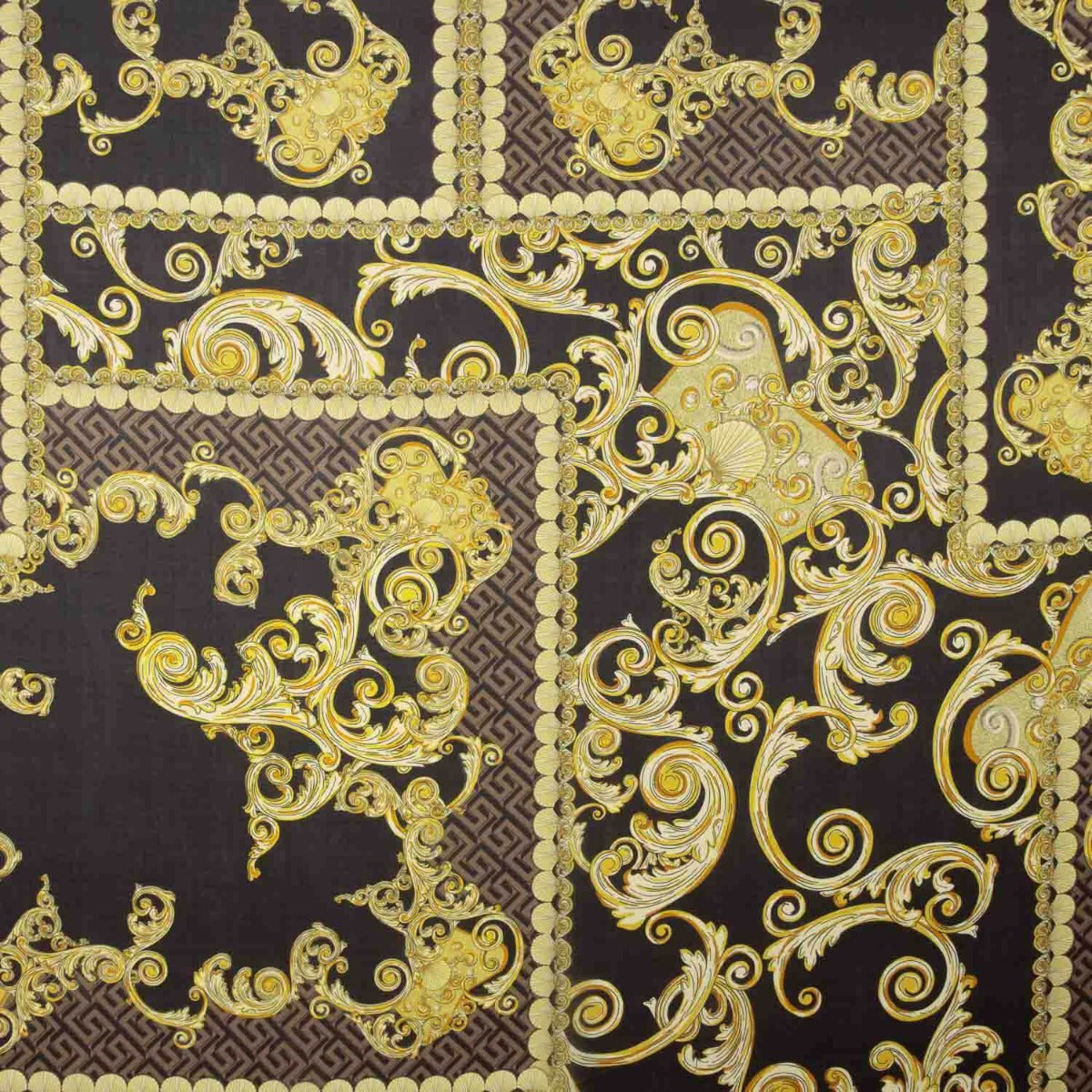 El diseño combina grecas clásicas, volutas doradas, conchas y motivos ornamentales sobre fondos contrastados en negro y marrón, con guiños geométricos que recuerdan a la opulencia de los palacios europeos.