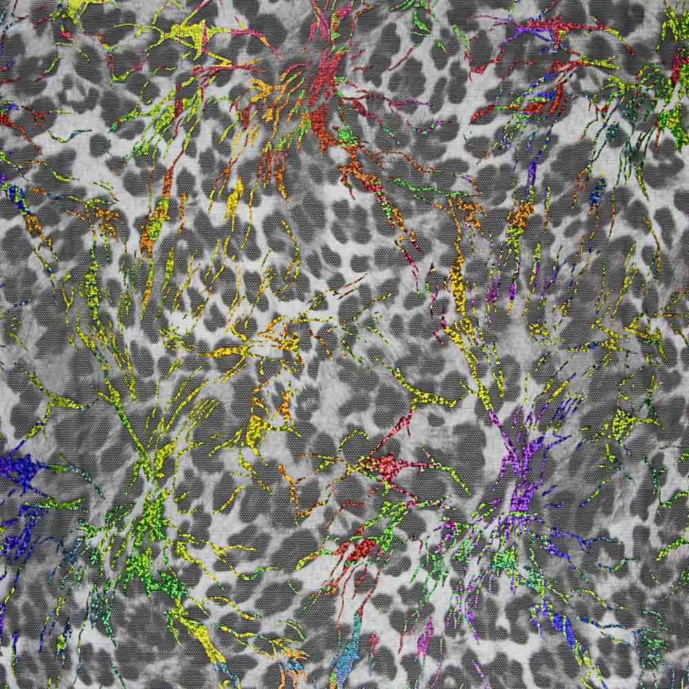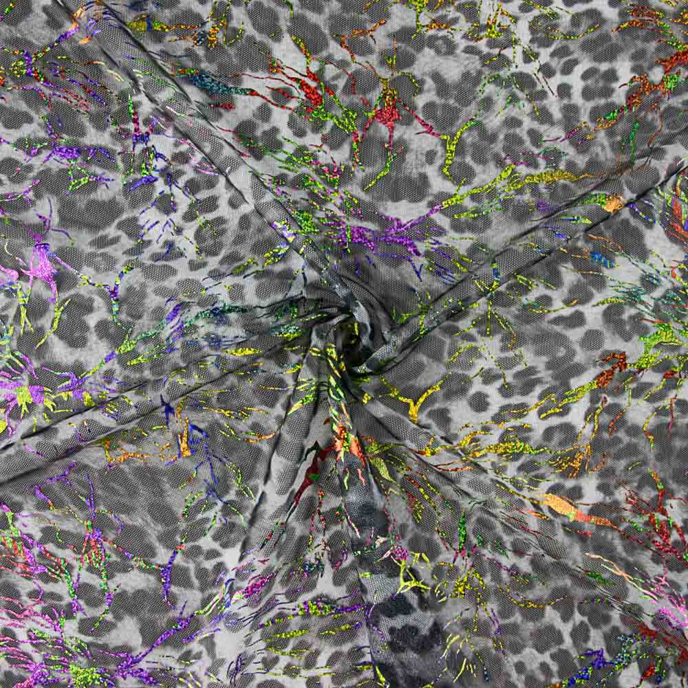 Stretch mesh fabric with a black animal print on a grey background. On top of the print is a multi-coloured laminated holographic pattern which gives off beautiful rainbow sparkles in the form of filigree patterns. Open weave tulle, elastic in both directions. Stretches without cracking of the laminate, with very good fabric return, adapting perfectly to the tightest of garments. Translucent elastic tulle, with little body, very drapey and light. Openwork lycra tulle ideal for applications in jerseys, costumes, and garments that require a total fit to the body.