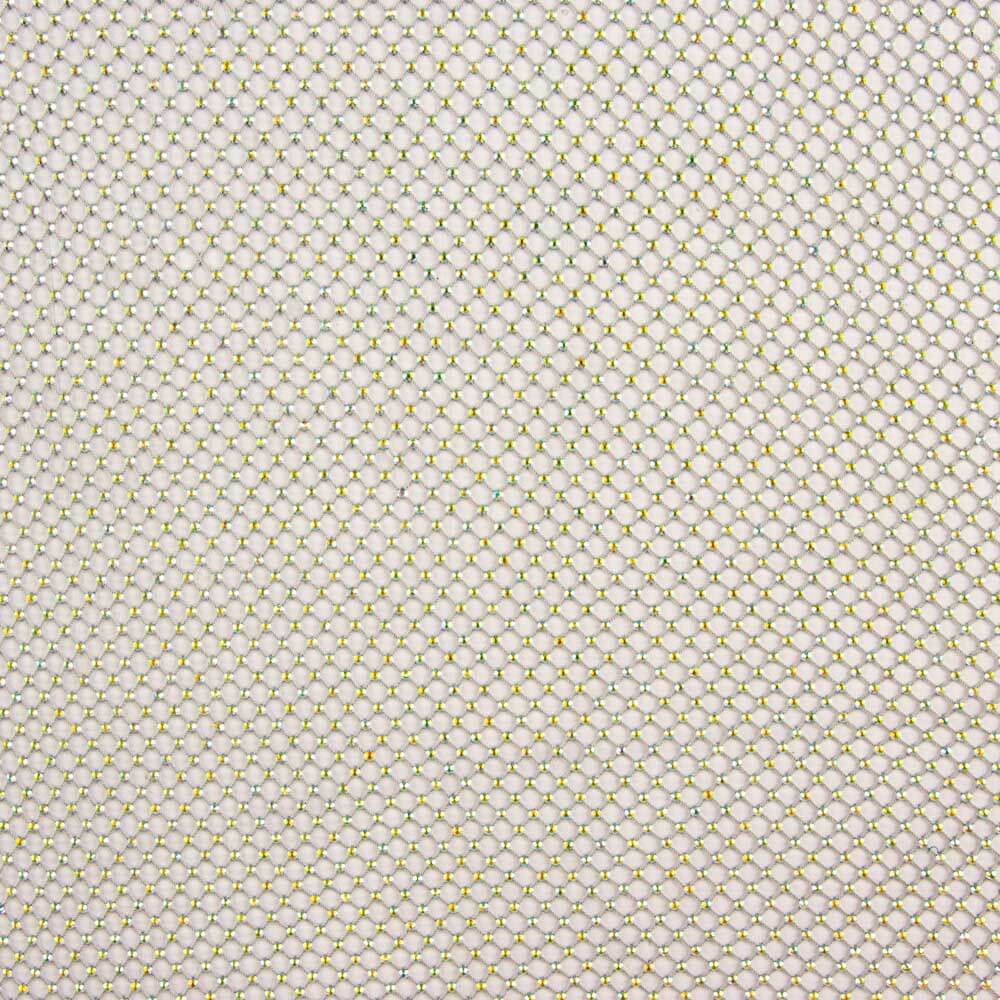 Grey net fabric with sparkling rhinestones. Net fabric with very luminous rhinestones for party wear and dresses. Net fabric that stretches due to its nest type even without elastane, with a lot of weight and drape and with a spectacular shine. There is a netting border without rhinestones on both sides, the netting area with rhinestones is approximately 135 cm wide. The netting rhombus is 1 centimetre and the rhinestones are approximately 2 millimetres.