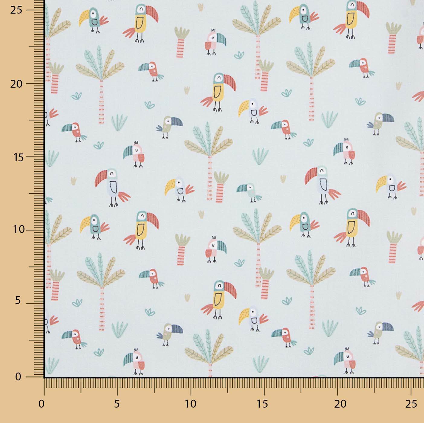 Jungle Club printed percale made from 100% cotton and woven in 200 thread count percale, ensuring softness, freshness and excellent resistance. It features a fun digital print with tropical motifs and exotic birds in soft tones on a light background, creating a cheerful and contemporary design, ideal for clothing and textile decoration. The percale fabric stands out for its smooth finish, soft touch and high breathability, providing comfort and durability in both clothing and home textiles.
