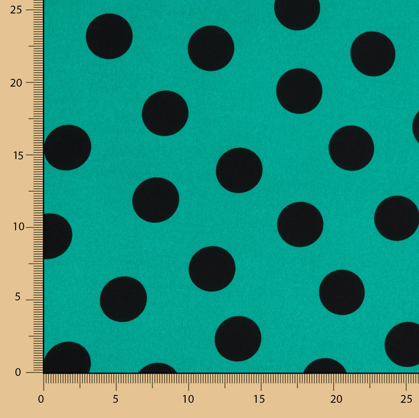 The Koshibo fabric with 33mm polka dots on an aquamarine washout background and black polka dots is an ideal choice for making fashionable garments with drape, comfort and style. It is a smooth, fine polyester fabric with a soft feel, highly prized for its fluidity and strength, perfect for warm climates and feminine designs. With a weight of 130 g/m² and a width of 150 cm, Koshibo is easy to work with and offers excellent performance in clothing projects. Its slightly grainy texture gives it a delicate finish, while its 100% polyester composition ensures durability, easy ironing and low maintenance. Ideal for blouses, skirts, loose dresses, flowing trousers and nightgowns, it is an essential staple for any wardrobe.