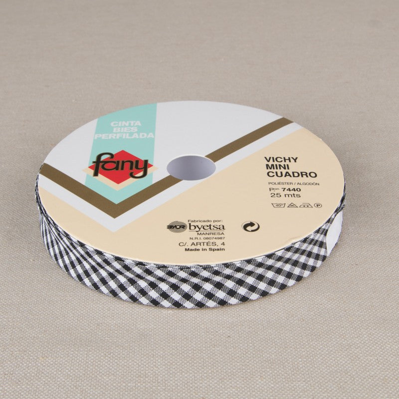 Cinta bies de 18 milímetros de ancho de cuadro vichy negro. Cintas bies de colores por metros en nuestra mercería online.