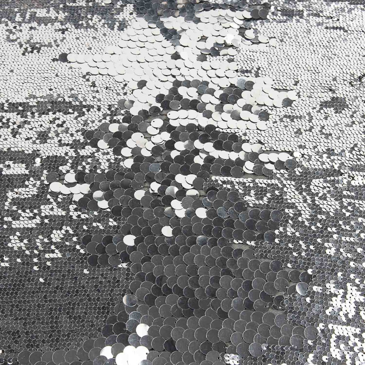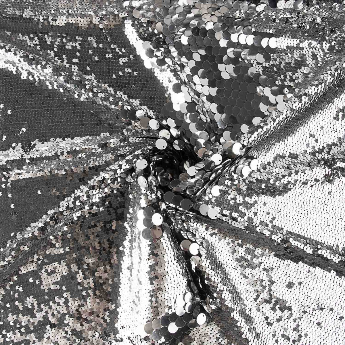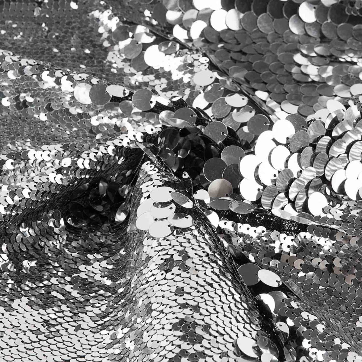 Tela de lentejuela con láminas plateadas en diferentes tamaños. por lado de color negro con base de tul en mismo color. Tela de lentejuela sobre una base de tul con colores llamativos y muy luminosos. Sientete la reina de la pista y deslumbra con esta fantasía de lentejuelas emitiendo destellos metalizados. Tela con peso y caída para decoraciones, disfraces o trajes de fiesta.