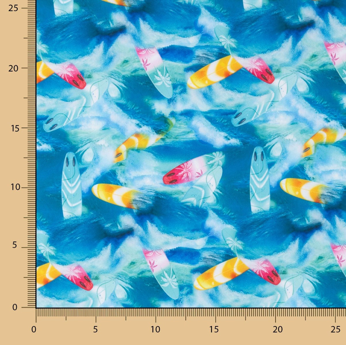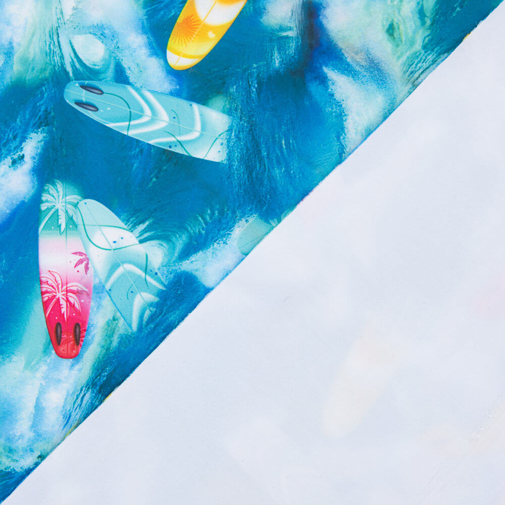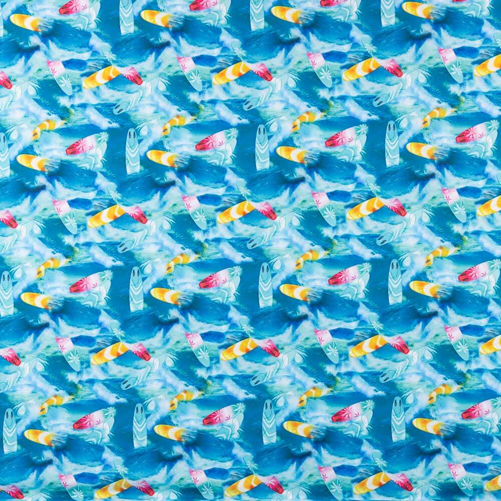 Lycra swimwear fabric printed in intense colours with a surfboard pattern. This fabric stands out for its stretch and fit, providing comfort and freedom of movement. The printed design adds a vibrant and modern touch, perfect for creating unique and attractive garments. With excellent water and chlorine resistance, this fabric guarantees durability and performance.