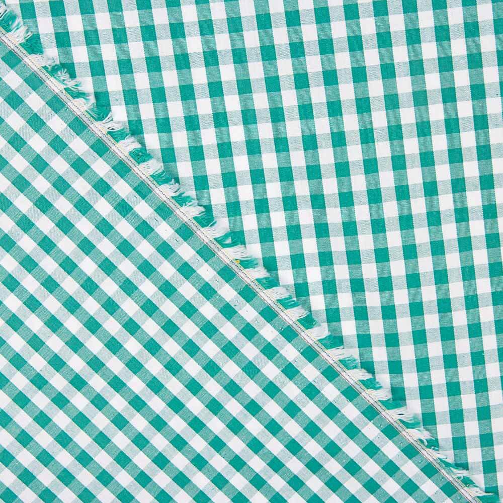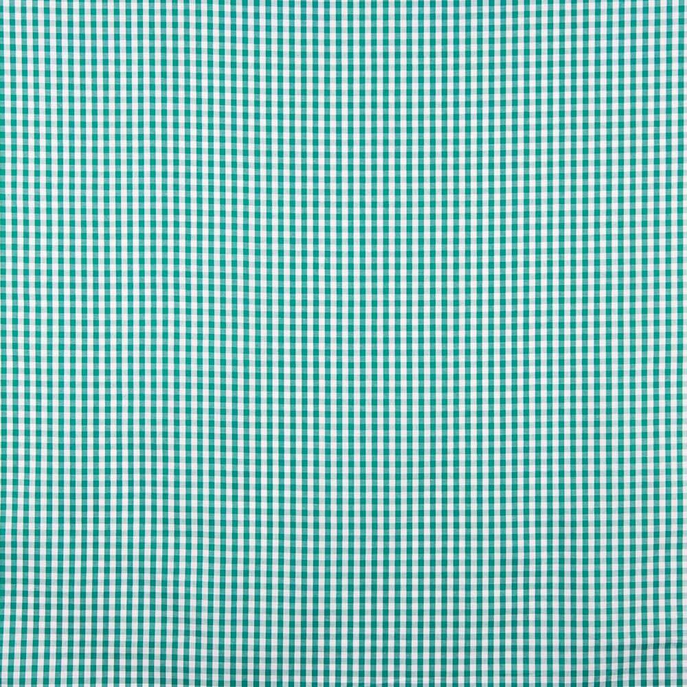 Cotton poplin fabric with a 6mm sideways check pattern in green and white, known as a vichy check. Cotton poplin is a very soft, fine, supportive and versatile fabric. Poplin is a perfect basic fabric for sewing cushions, bed linen, patchwork and all kinds of decorations.