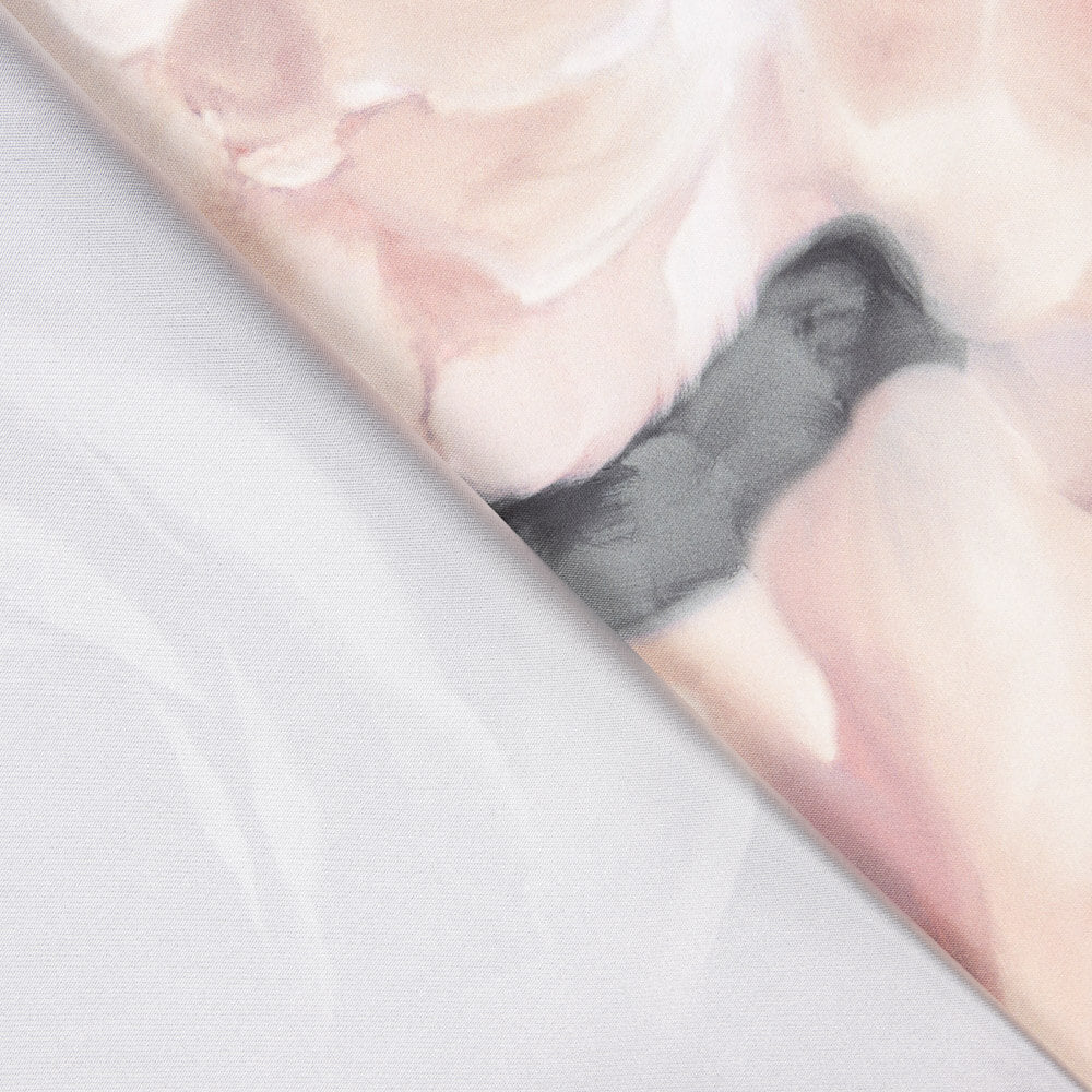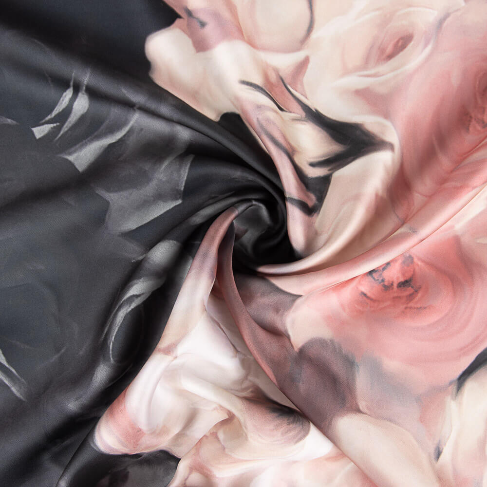 Tela de raso mikado estampada con flores en cenefa de color rosas. El dibujo es en horizontal por lo que es recomendable coger el contorno de cintura. Tela estampada de flores de colores, con cuerpo, de textura muy suave y agradable, ideal para la confección de vestidos de fiesta y ceremonias, así como para faldas y boleros.