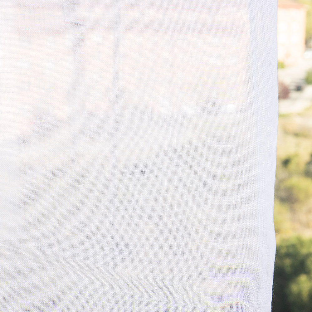 Etamin sheer net curtain Natural White. Etamin net curtain fabric with low lead ribbon finish in natural white. 100% polyester fabric in a practical width of 280cm. It is a translucent sheer fabric with good drape for curtain sew. Due to its composition, it is a very easy care fabric. It does not shrink and can be machine washed at 30° with a gentle spin. If you hang the curtains damp, with their own weight they will be perfect without the need for ironing. It is recommended not to use fabric softener. Do not tumble dry. The fabric is already finished in one of the selvedges of the width with a lead cord, which serves as a weight, ready to use as the end of the bottom of your curtains. for home decorations. Fine sheer fabric, basic, with open weft and low opacity, allows the entry of light without seeing the interior of the house at first sight as long as the fabric is gathered or with slats. Consult our sales department for the necessary length for different types of curtains: Japanese panel, boards, ruffling tape... you can consult the different curtain tapes available in this link.
