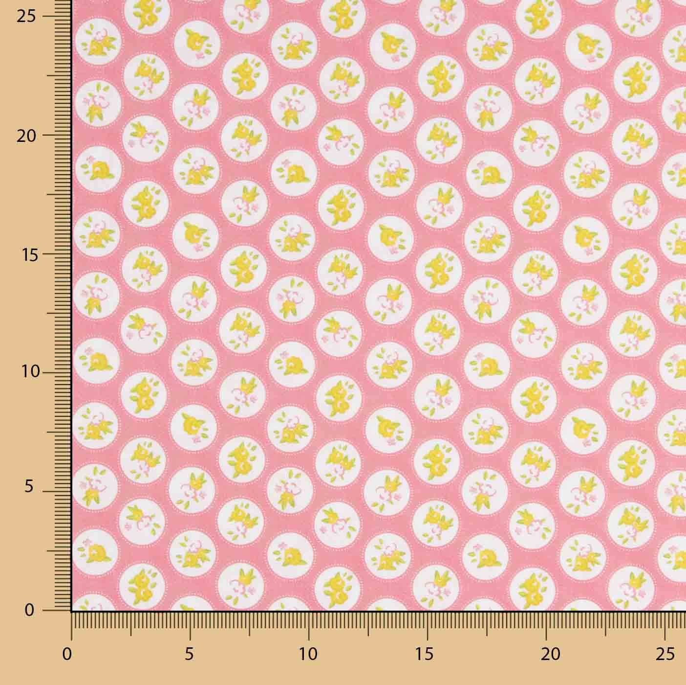 Composition: 100% cotton | Quality: 200 thread count percale | Width: 140 cm | Printing: High-definition digital | Design: Yellow bunnies in white circles on a pink background | Uses: Children's clothing, sheets, duvet covers, dresses, cushions and themed decorations