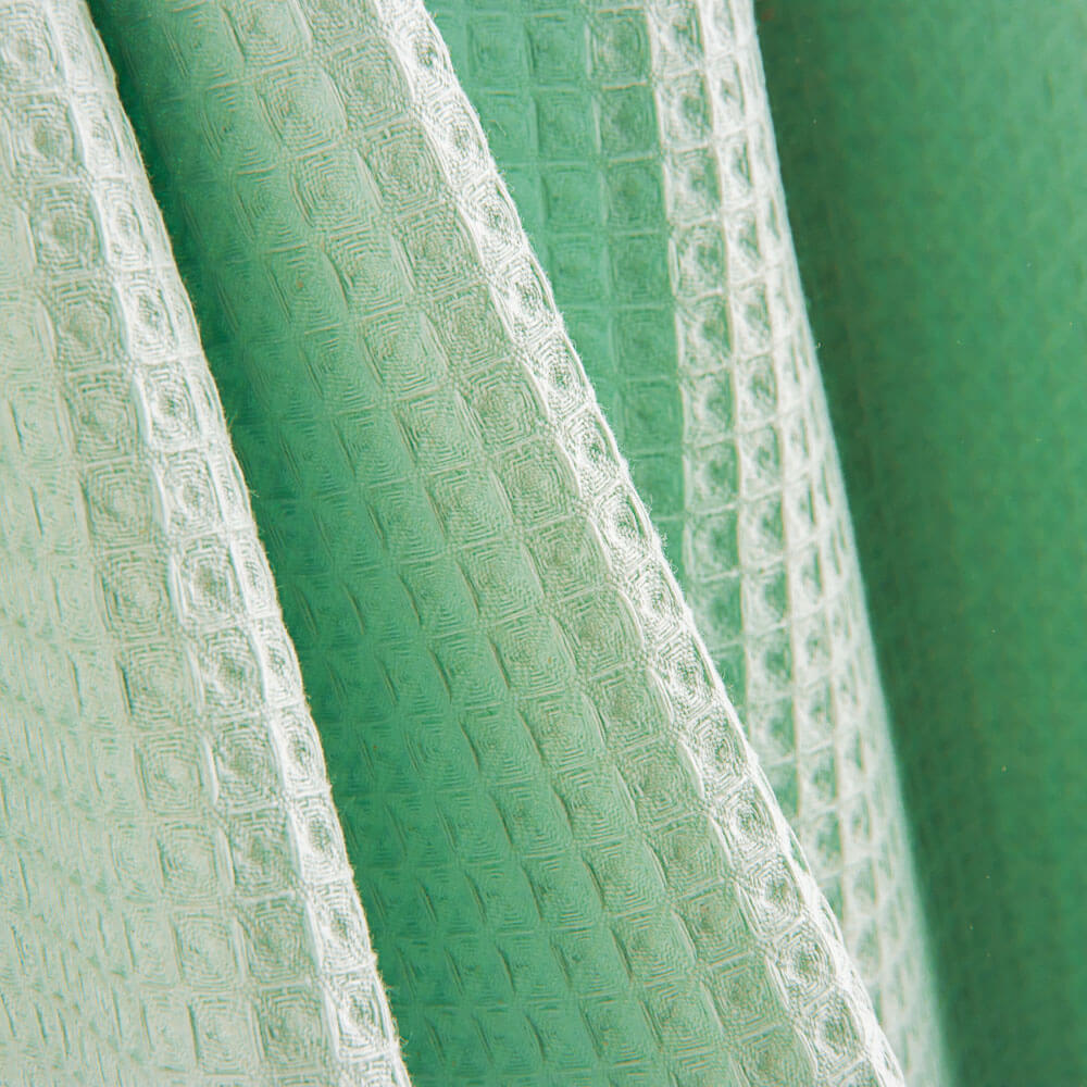 Waflle pique fabric in aqua green. Fabric also known as piqué towel, because of the squares in relief that make up the fabric. It has the perfect body and weight for summer bedspreads, cooing and baby accessories. Very sweet fabric due to its cotton composition, it can be used as a pram bag and as a summer quilt.