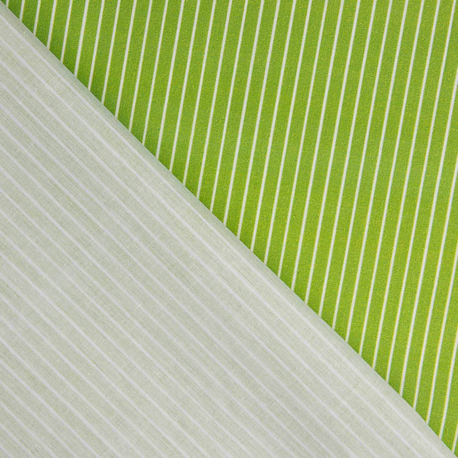 Composition: 100% cotton | Quality: 200 thread count percale | Width: 140 cm | Printing: High-definition digital | Design: Thin white stripes on a pistachio background | Uses: Sheets, duvet covers, shirts, dresses, blouses, cushions and decoration