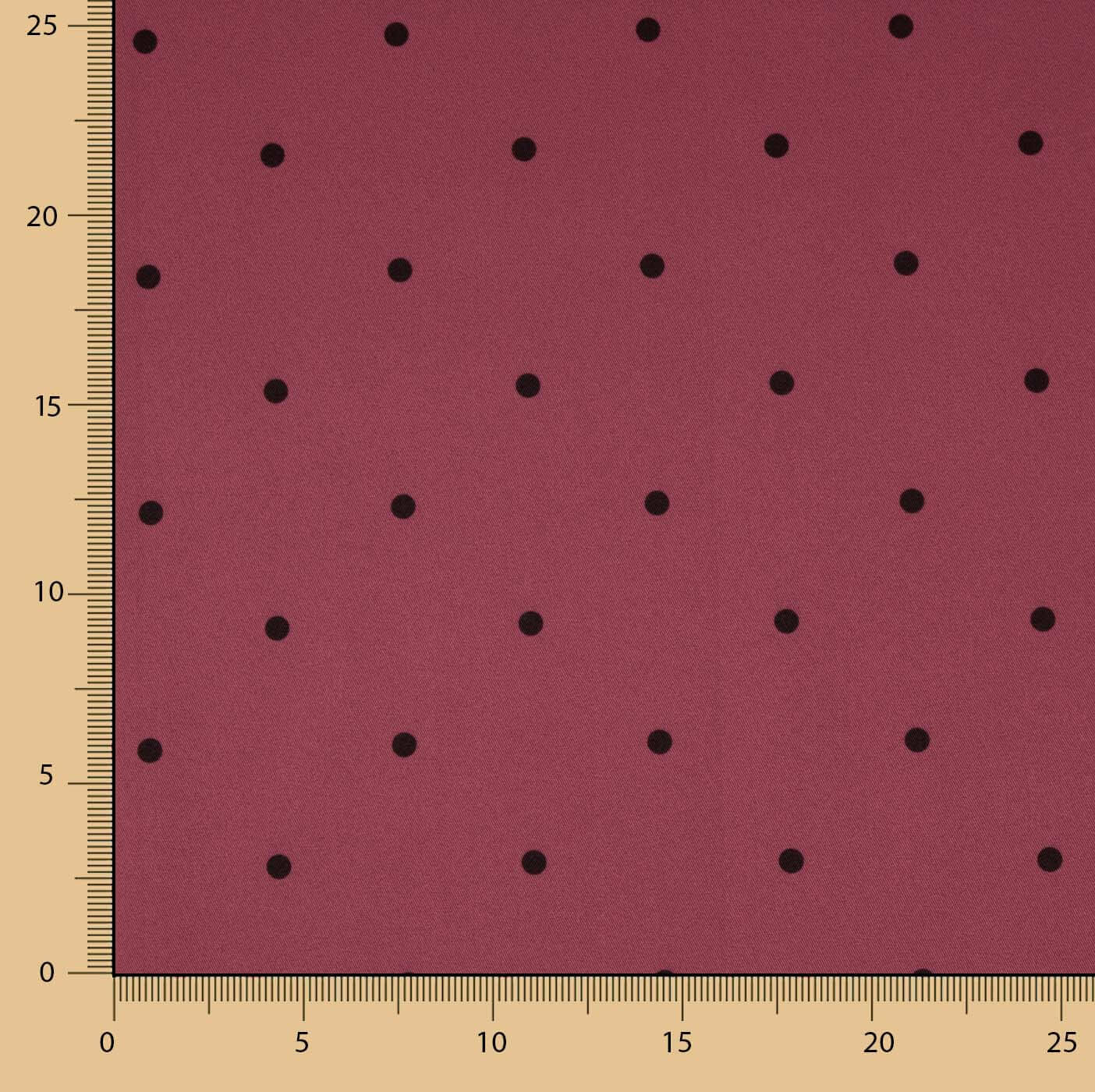 Composition: 97% polyester – 3% spandex | Width: 150 cm | Elasticity: Horizontal and slight vertical | Design: 7 mm black polka dots on maroon | Collection: Flamenca Ribes y Casals