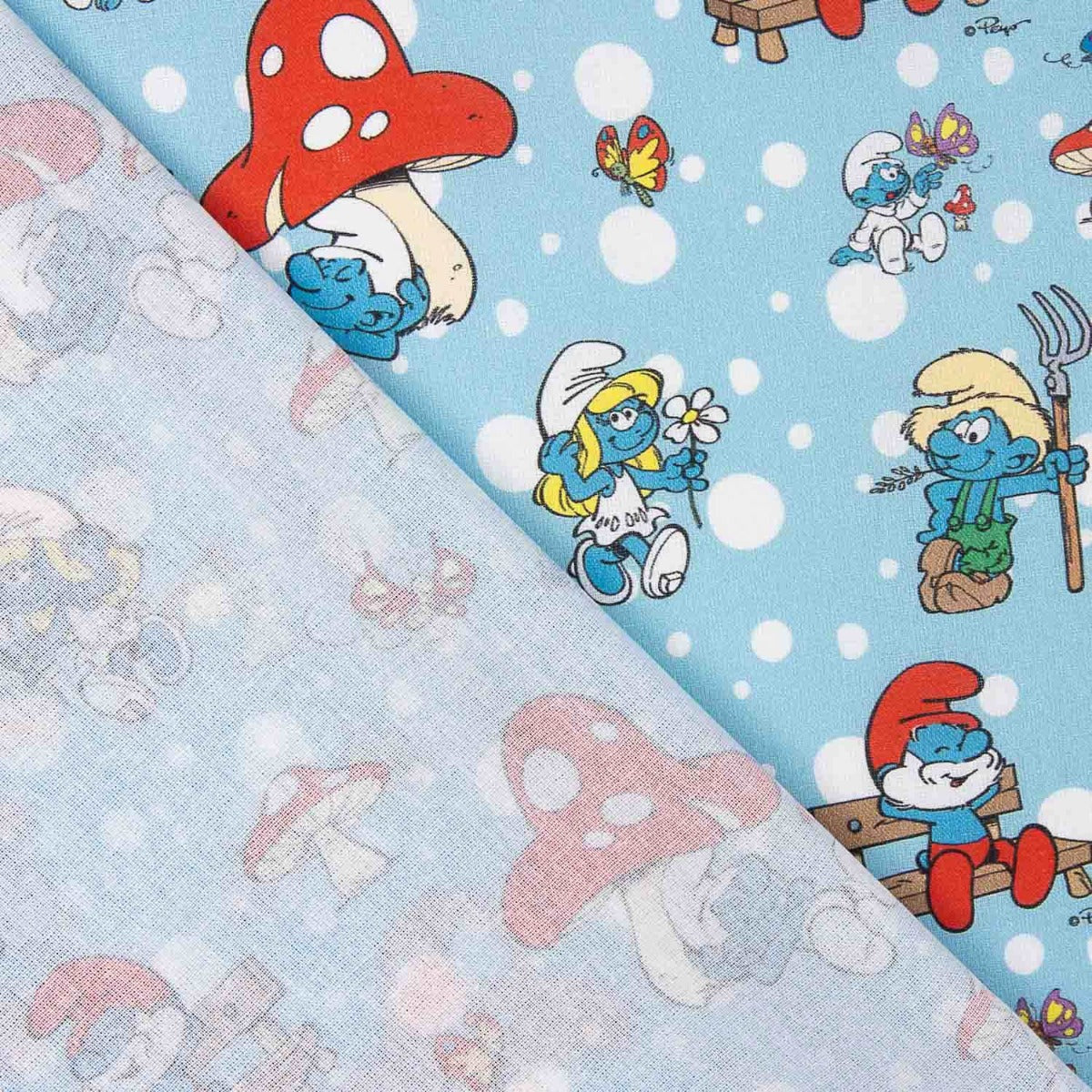Tela de popelín estilo cretona 100% algodón con estampado digital infantil de Los Pitufos en un fondo azul celeste decorado con setas rojas, mariposas y detalles de la naturaleza.