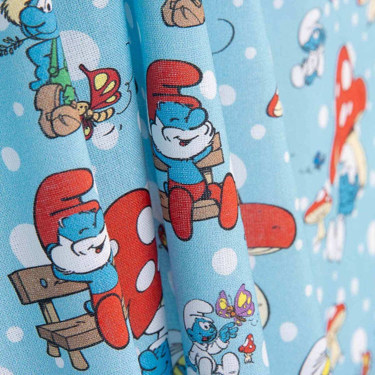 - diseño: personajes clásicos de Los Pitufos en escenas campestres, acompañados de flores, bancos y hongos de colores, perfecto para cuartos infantiles, ropa y complementos. ancho: 138 cm, versátil y fácil de manejar.