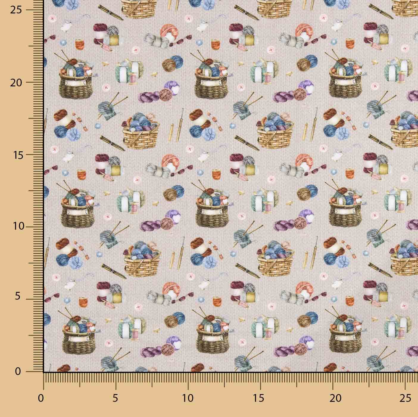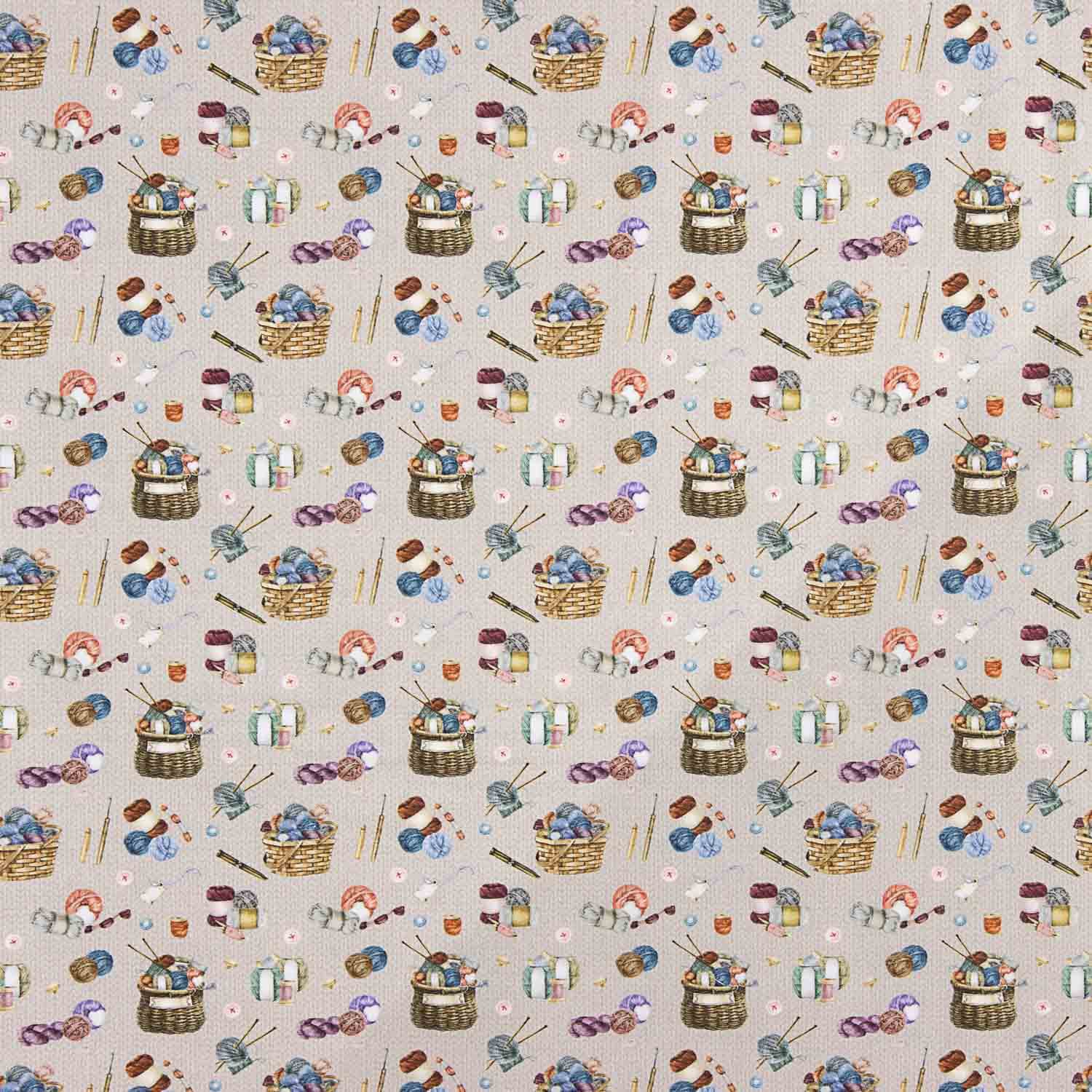 100% cotton poplin fabric 150 cm wide with a print of baskets with wool, balls of yarn, knitting needles and small sewing accessories in soft tones on a light background, creating a warm, creative design that is perfect for knitting and sewing enthusiasts.