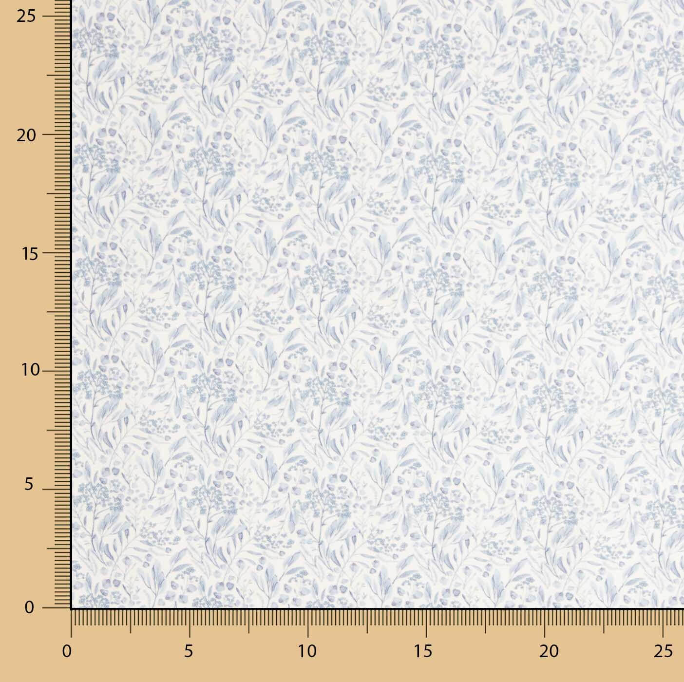 100% Cotton Poplin with Floral Blue Garden print with a width of 150 cm. Natural cotton fabric with a delicate floral print in powder blue tones on a light background, ideal for elegant and timeless clothing.