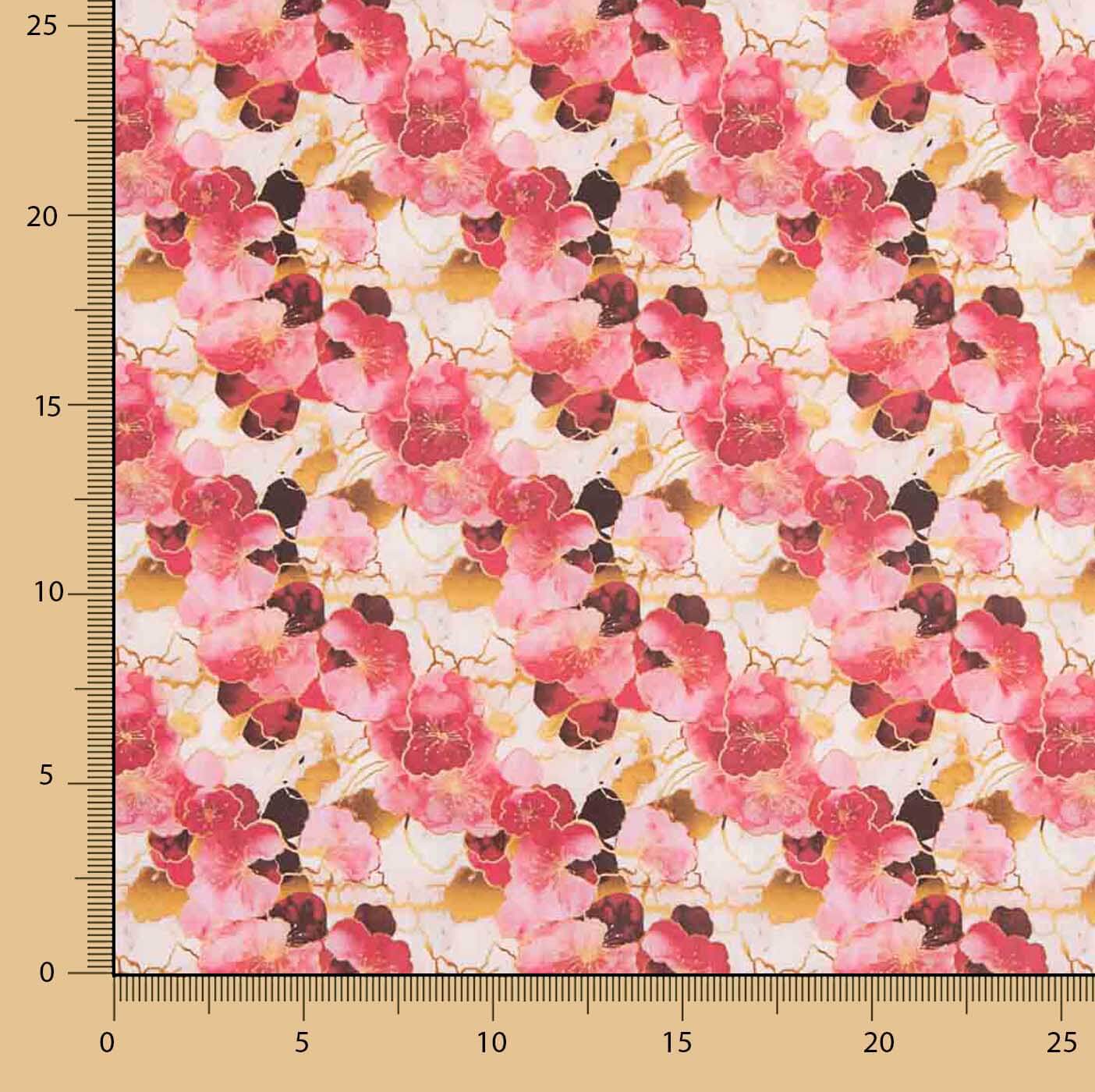 Cotton poplin with a striking watercolour-style floral print in shades of pink, maroon and gold on a light background. Its 100% cotton composition makes it a cool, breathable and very comfortable fabric for clothing. Width: 150 cm. Ideal for shirts, dresses, blouses, children's clothing, accessories and home décor such as cushions or tablecloths.