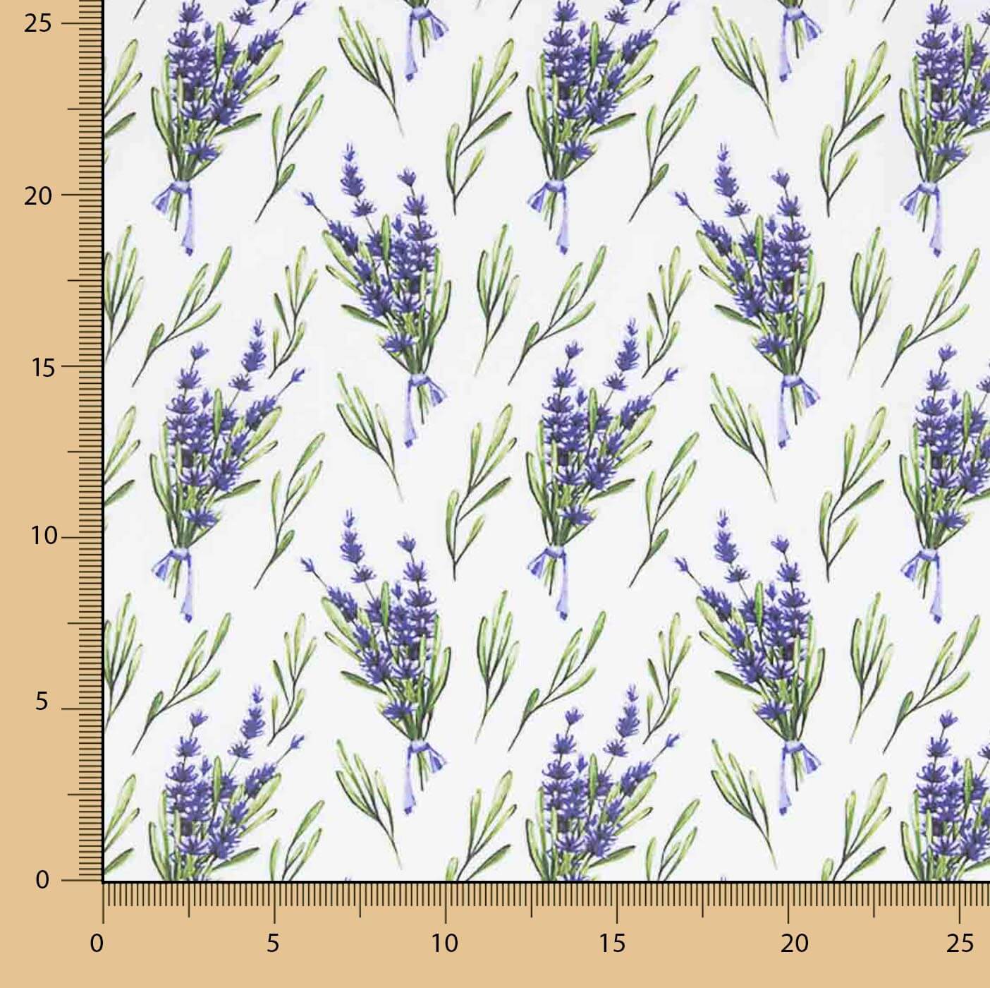 Cotton poplin with a delicate print of lavender bouquets in shades of purple and green on a white background. Width: 150 cm. Composition: 100% cotton. Ideal for making shirts, dresses, children's clothing, accessories, patchwork or home décor.
