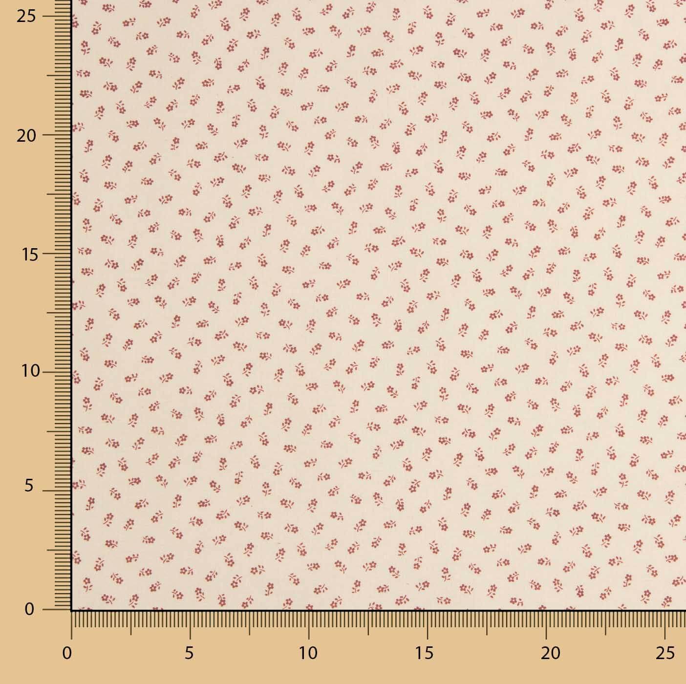 100% cotton poplin with red micro floral print, width 150 cm. Small red flowers on a natural beige background, ideal for women's and children's clothing and romantic styles.