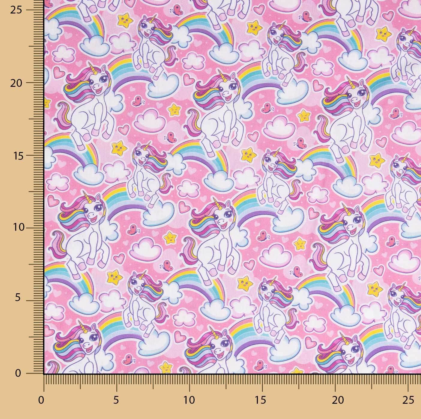 This 100% cotton poplin, with a width of 150 cm, is ideal for patchwork, children's clothing, crafts and décor. Its magical print of unicorns with rainbows, clo