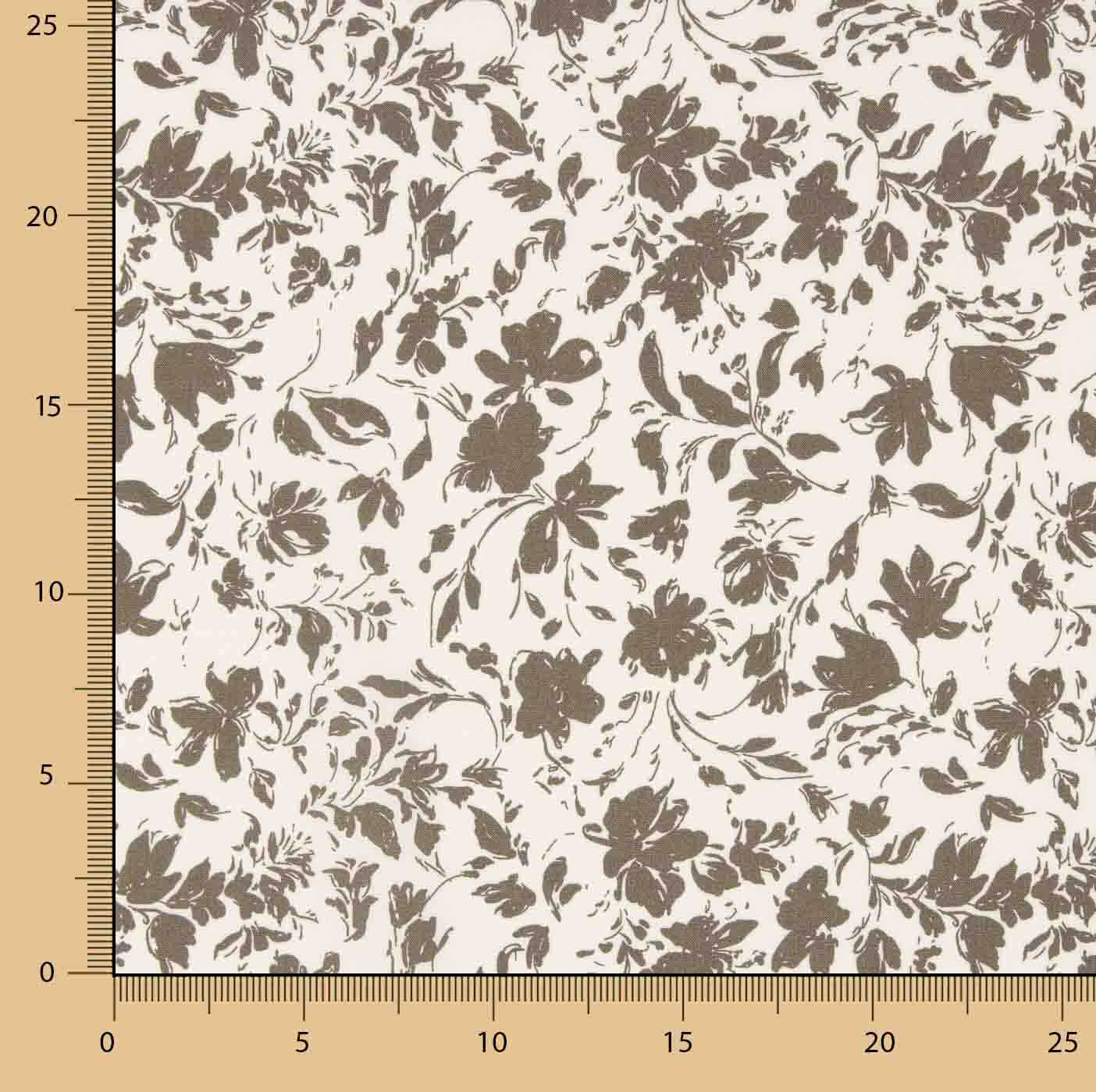 100% bamboo poplin fabric, 140 cm wide, with a floral print in taupe on a white background, printed on one side only. It is a soft, lightweight fabric that is very pleasant to the touch, with a fluid drape that adds elegance and movement to garments. Its bamboo composition provides breathability and natural comfort, ideal for everyday use. It is Oeko-Tex certified, guaranteeing the absence of harmful substances. Perfect for making blouses, shirts, dresses, skirts and other comfortable and versatile garments.