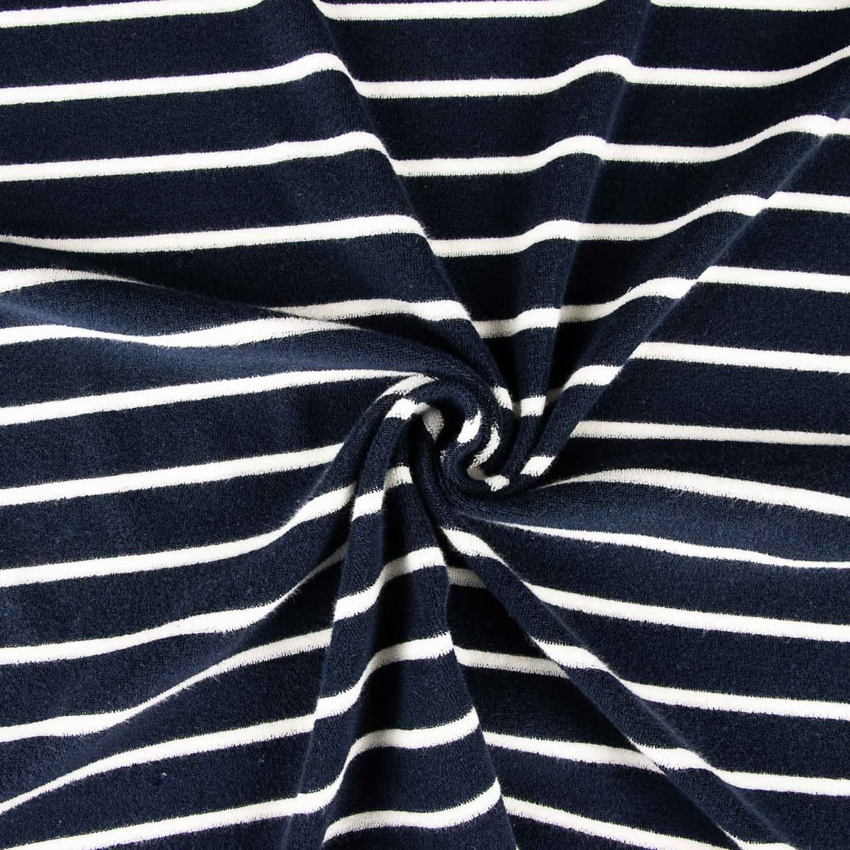 Tela de punto rizo en color marino y rayas blancas. Tela de punto que tiene por una cara rizo y por la otra es liso. Tela ideal para ropa deportiva, accesorios de playa o polo de verano. Tela de tacto muy agradable y suave.