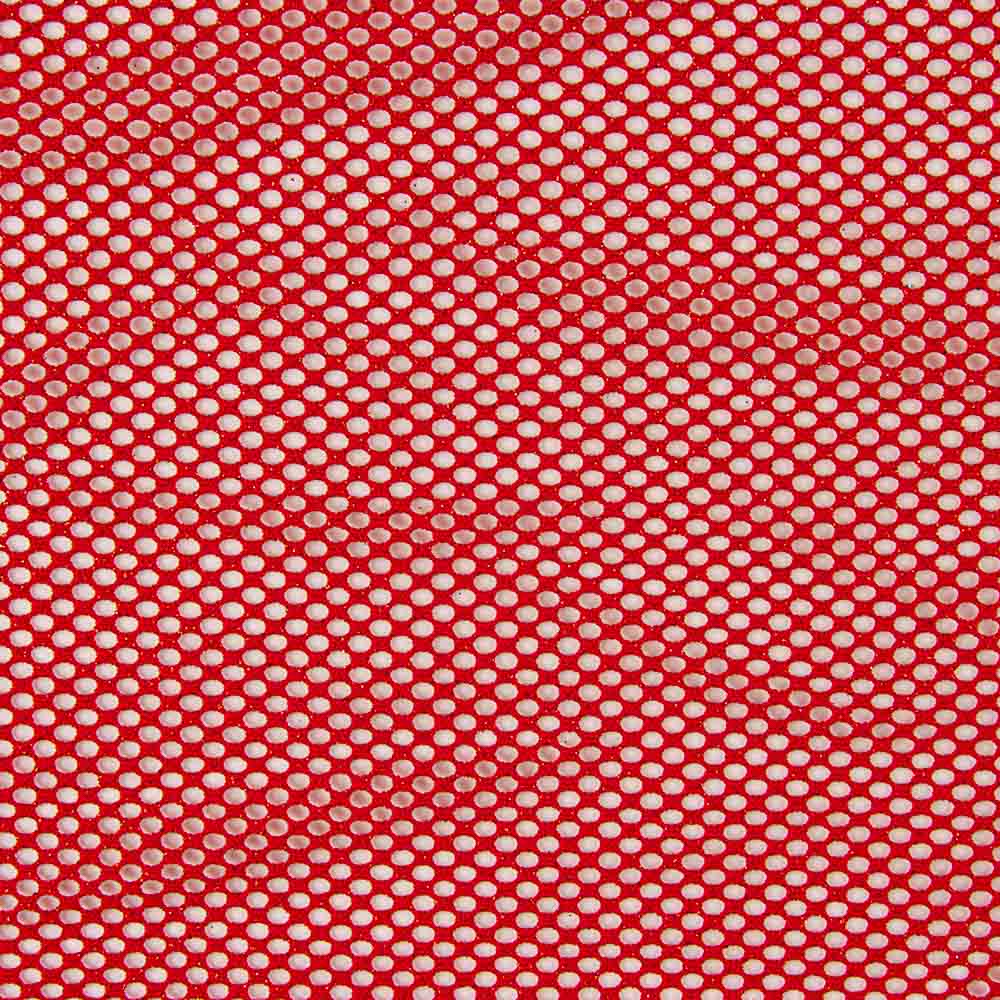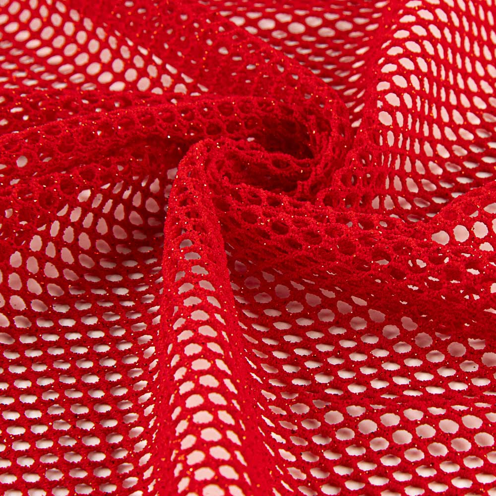 Wide openwork netting fabric in red with glitter sparkles in the same colour. The width of the net is 3mm. It is a synthetic fabric that yields and stretches but without elastane in the composition, simply because of the structure of the fabric. Mesh fabric with drape, resistant and visually striking. Slightly elastic net fabric for making sportswear or as a complement to sportswear, costumes and fantasy fashion. Fabric used for decorations due to its versatility simulating nets creating transparencies.