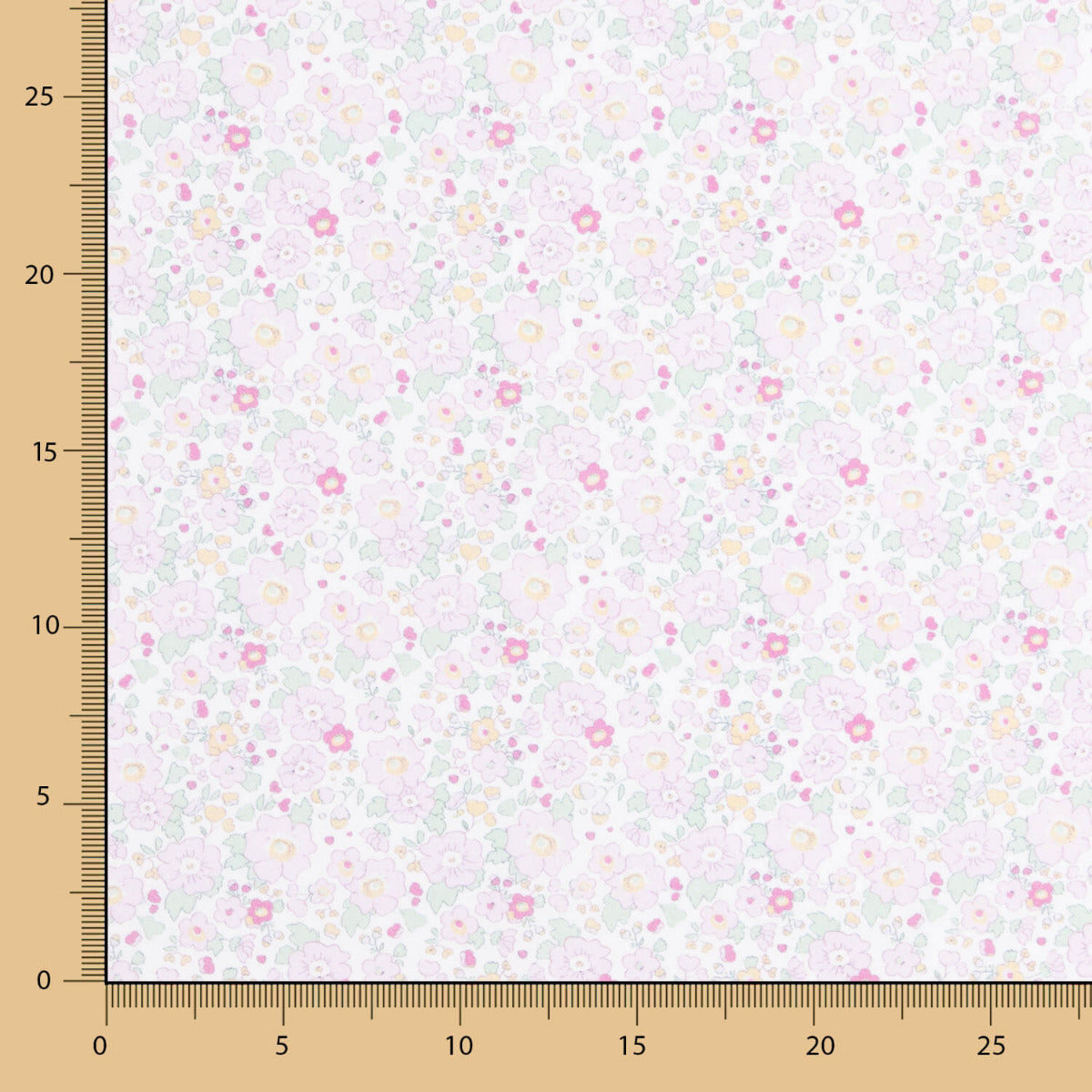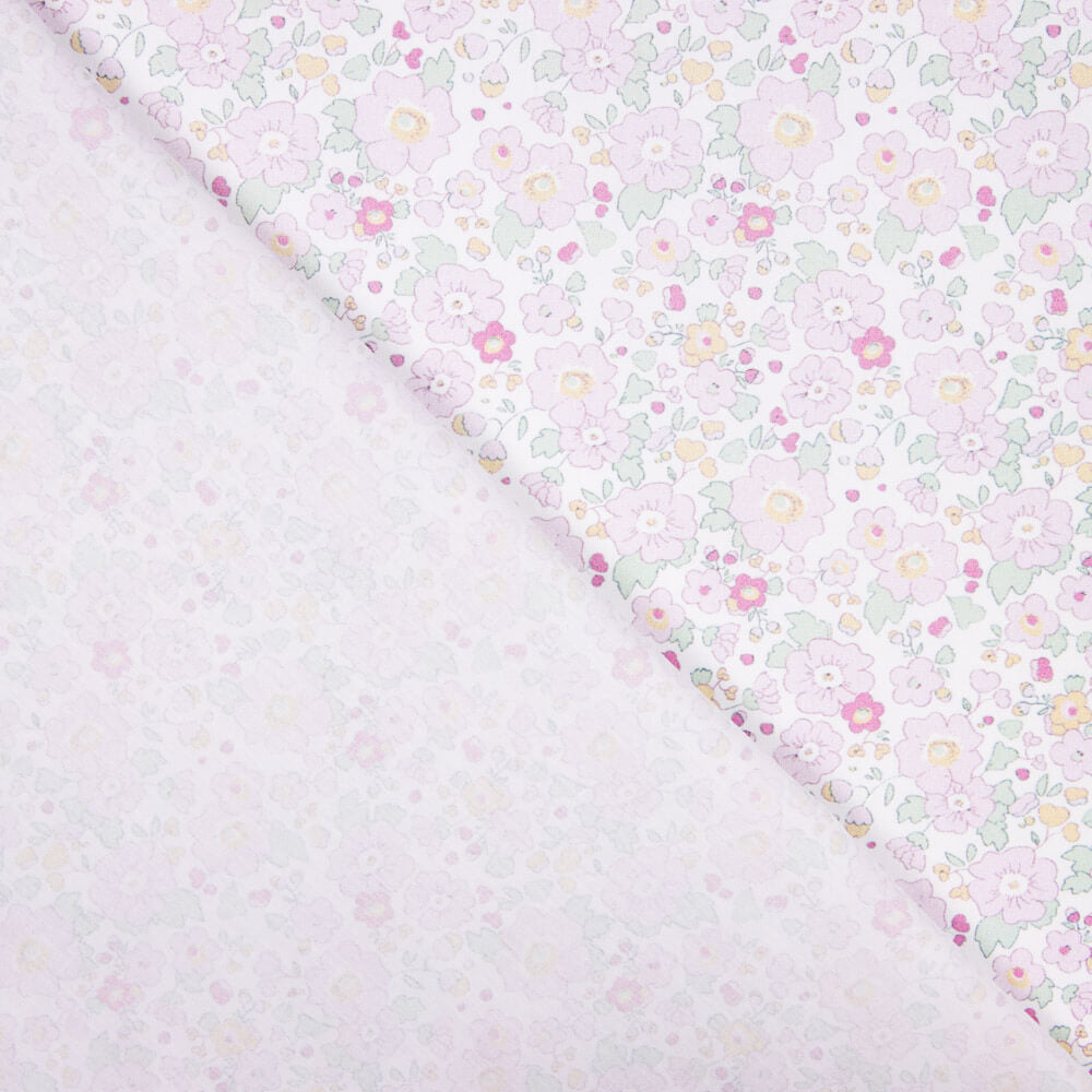 Tela de algodón en popelín estampada de flores que combinan tonos rosas y malva sobre base en blanco, fina y suave, ideal para todo tipo de decoraciones.