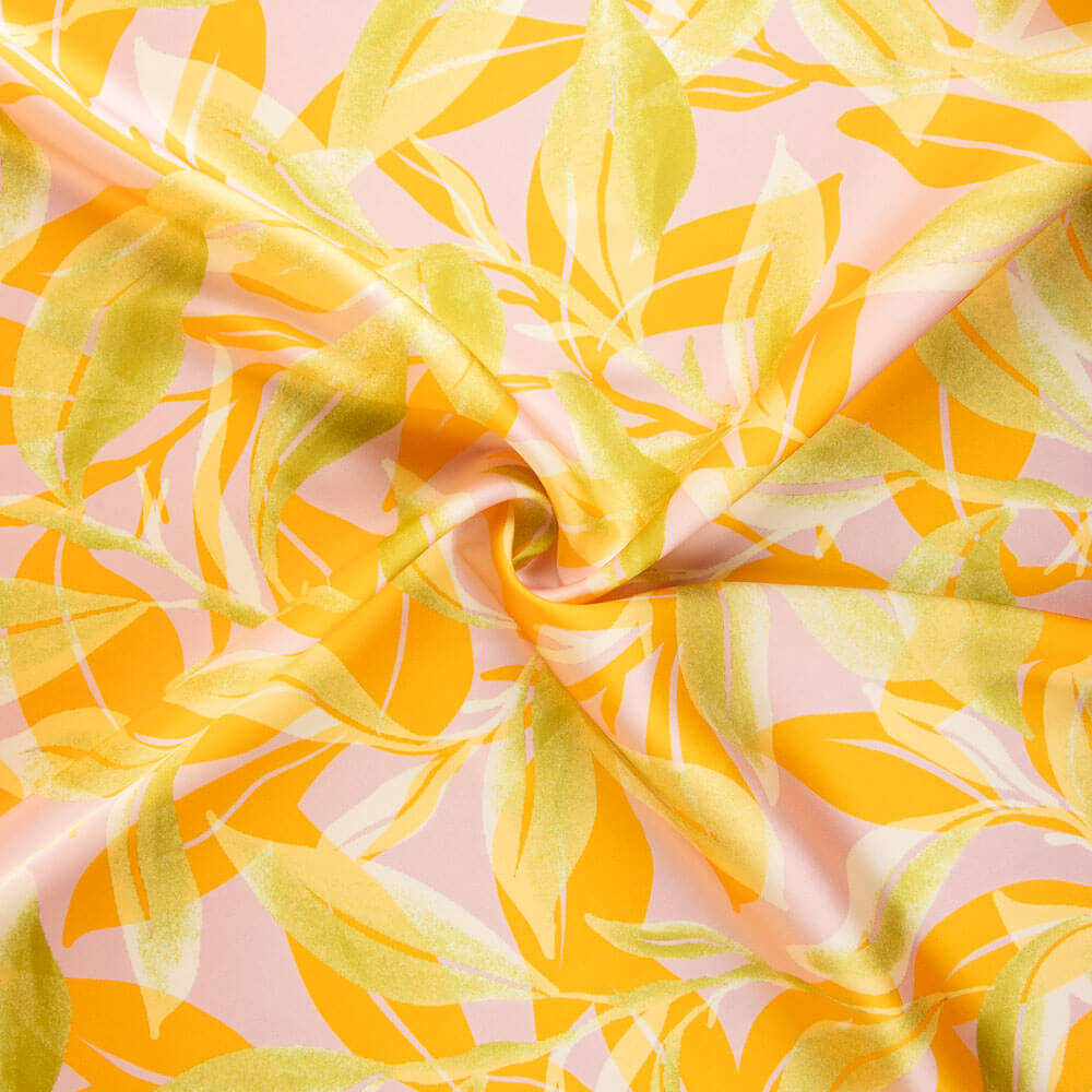 Tela de satén poliéster de tacto sedoso, suave y agradable modelo palmar rosado. Tela de satén con un brillo sutil y mucha caida ideal para crear vestidos, blusas creando una silueta fluida y favorecedora.