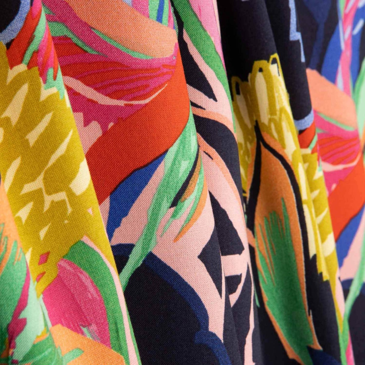 Su espectacular estampado de flores tropicales y hojas en tonos vivos como rojo, verde, azul, amarillo y fucsia, contrasta sobre un fondo negro, creando un diseño impactante y lleno de vida.