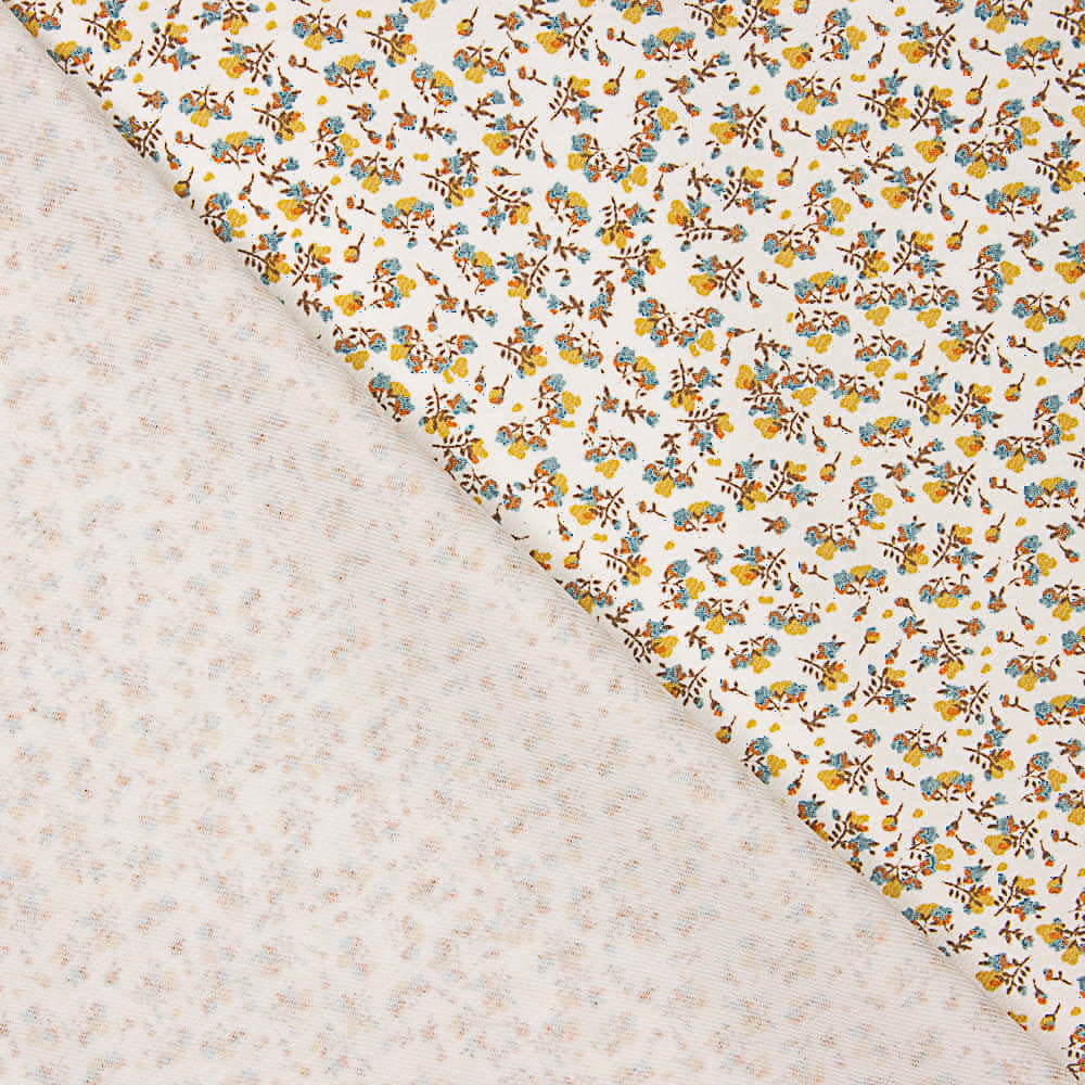 Tela de viyela en algodón con estampado de pequeñas flores de tonos amarillos sobre fondo blanco.