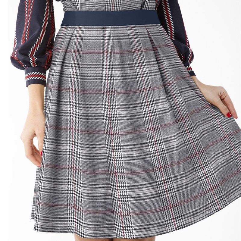 Buy this prince of Wales fabric with black and white checks and thin red lines. Prince of Wales pattern on a strong twill with body, contains a low percentage of spandex that makes it a bit elastic. This checked pattern is a trend for fall winter season, you can create skirts, dresses, troussers and jackets.