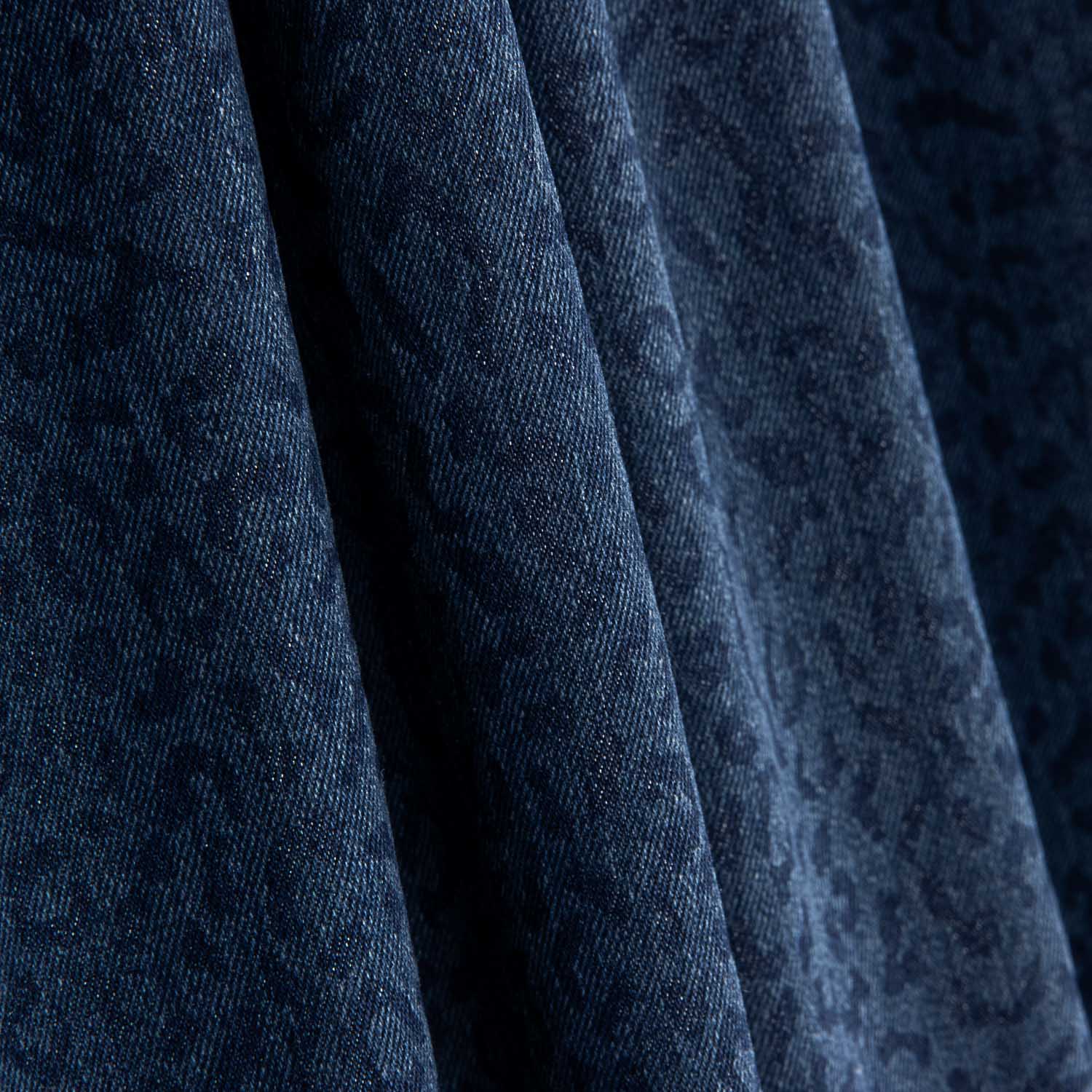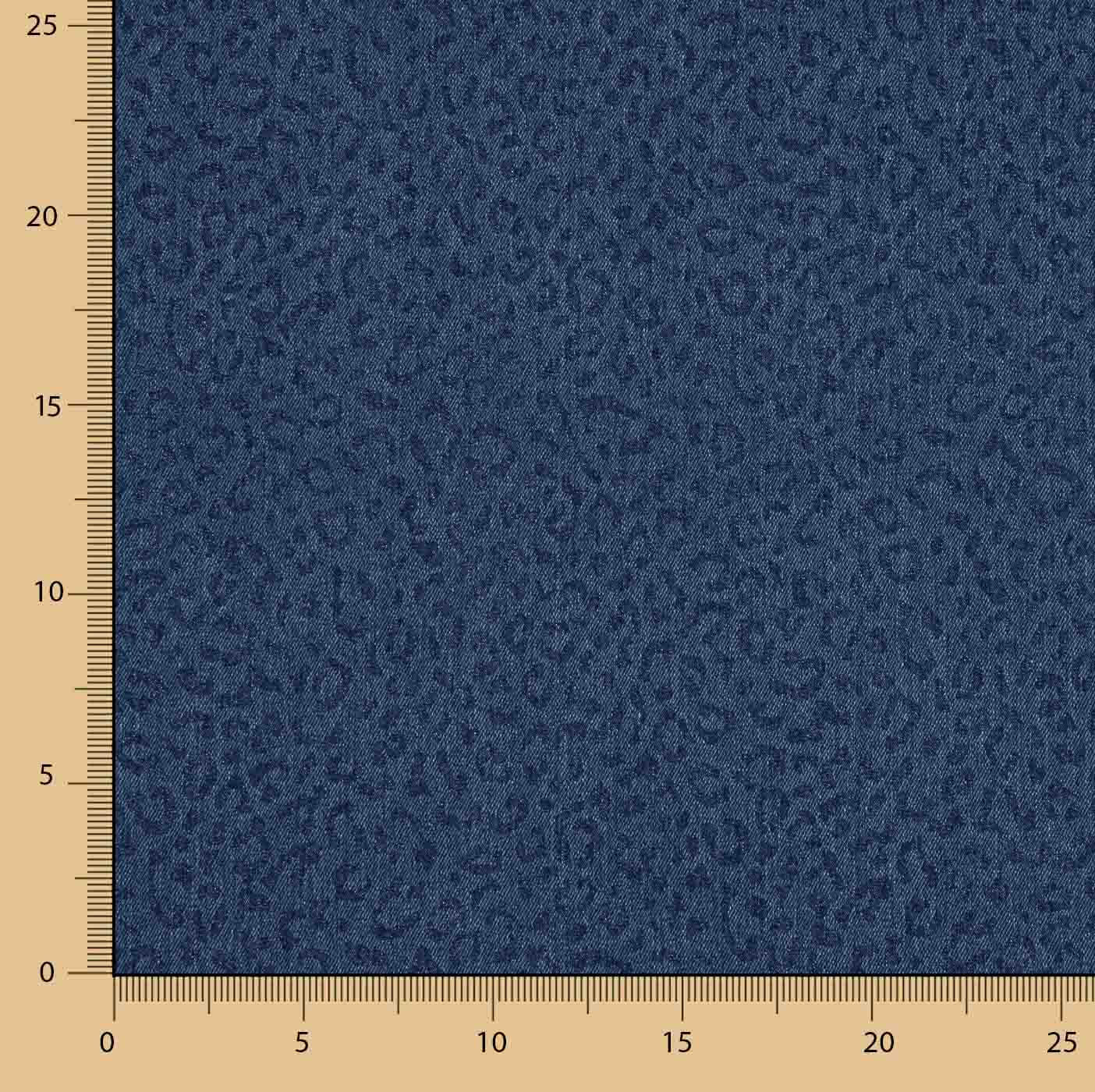 Indigo blue leopard print stretch denim, a modern and versatile fabric that combines the character of denim with a sophisticated animal print design. With a composition of 95% cotton and 5% elastane, it offers comfort, strength and elasticity for a perfect fit.