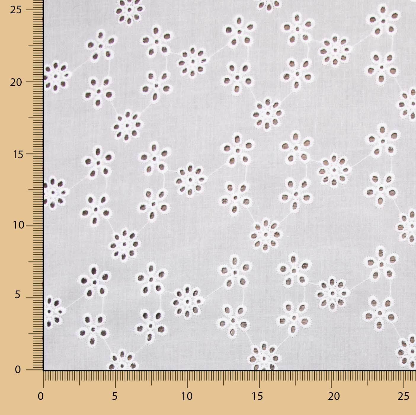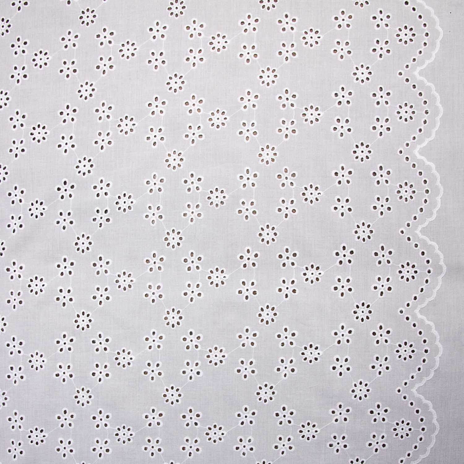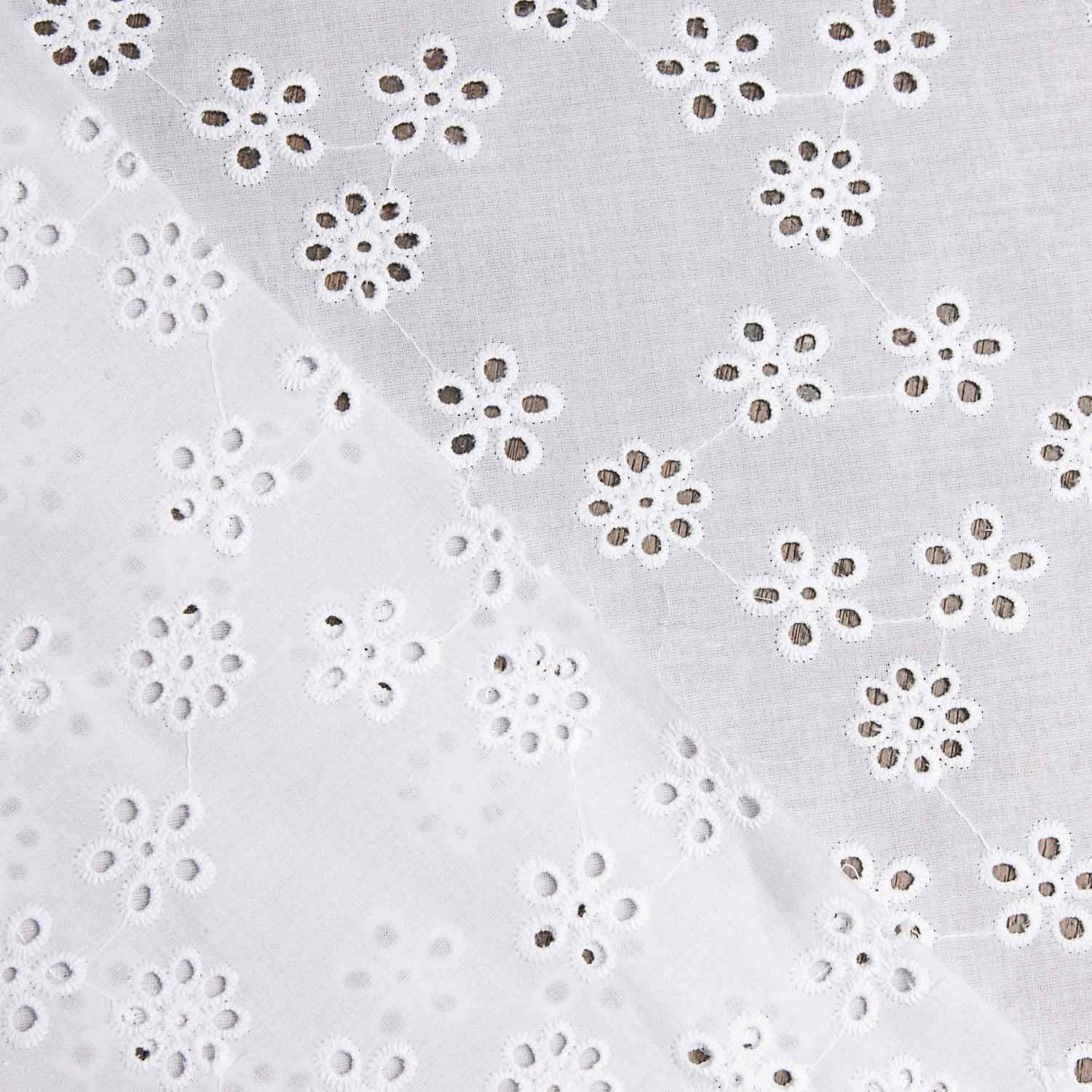 Fabric with natural white bouquet Swiss embroidery. 100% white voile cotton fabric, soft, slightly stiff. Fine cotton flamenco openwork embroidery, with a natural feel and relief created by the embroidery itself. High-quality embroidered fabric, interspersed with a subtle, charming perforation, creating a fresh and youthful play of transparencies. Ideal fabric for making Sevillana dresses, appliqués and flamenco ruffles. You can use this type of Swiss voile embroidery for your freshest creations, adding a romantic and carefree air: Ibiza dresses, blouses, tops, skirts... as well as for accessories and embellishments.