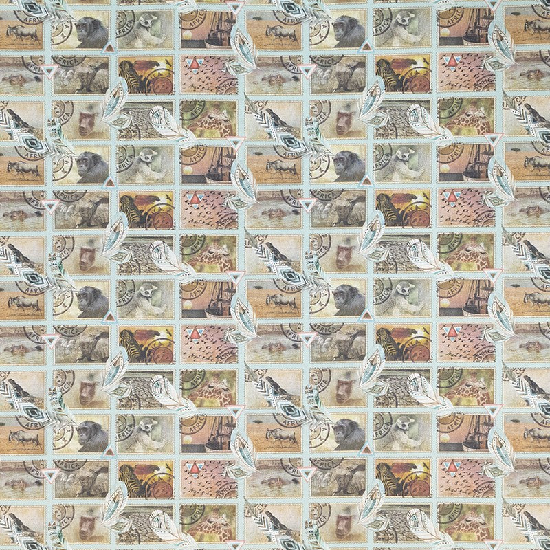 Buy fabric for home decoration made of printed cotton with africans stamps on a greenish background. High quality fabric for home and decoration with an original print, strong, thin and very soft and pleasant to touch. Cotton fabric perfect for home decoration, making cushions and bags, but also crafting.