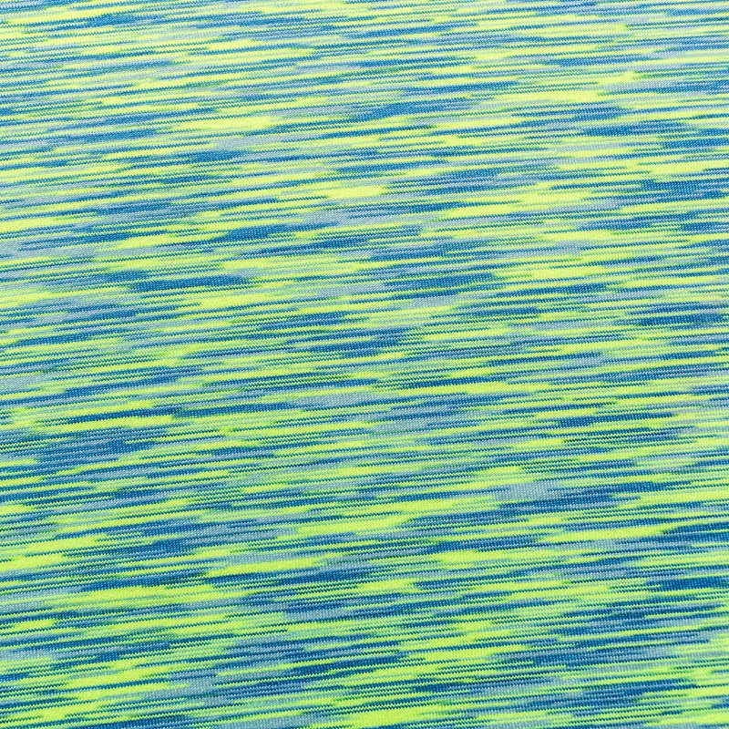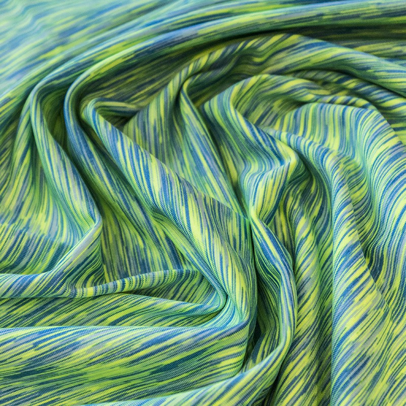 Buy fabric online for leggings and mesh with multicolored stripes on a neon yellow background. Fabric made of thin mesh, with drape, weight and very elastic thanks to its high percentage of Spandex. It is a stretch fabric for sport clothing such as leggings and fitted troussers. Perfect for making sport suits and body for rhythmic gymnastics because it doesn't hinder the movements of the body. Stretches in both directions.