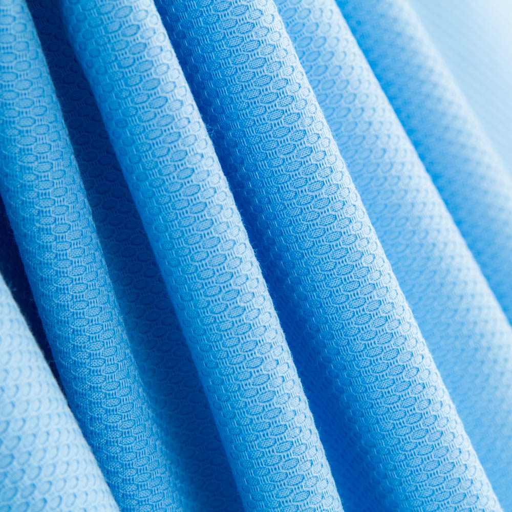 Tela piqué de algodón con certificado OEKO-TEX de color azul. La tela piqué tiene una pequeña trama con cierto relieve, sostenida, de textura muy suave y agradable, no abrasiva. Es una tela infantil ideal para la confección de sábanas de cuna, cucos, arrullos y ropa infantil.