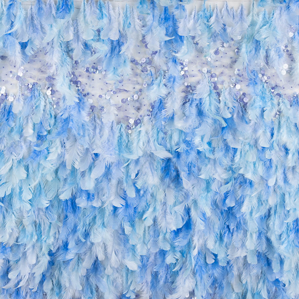 Tela de fantasía con plumas cosidas con lentejuela de color azul. Base de georgette en el mismo tono con plumas cosidas para vestidos de fiesta o accesorios de fiesta. Recomendamos tratado con tintorería.
