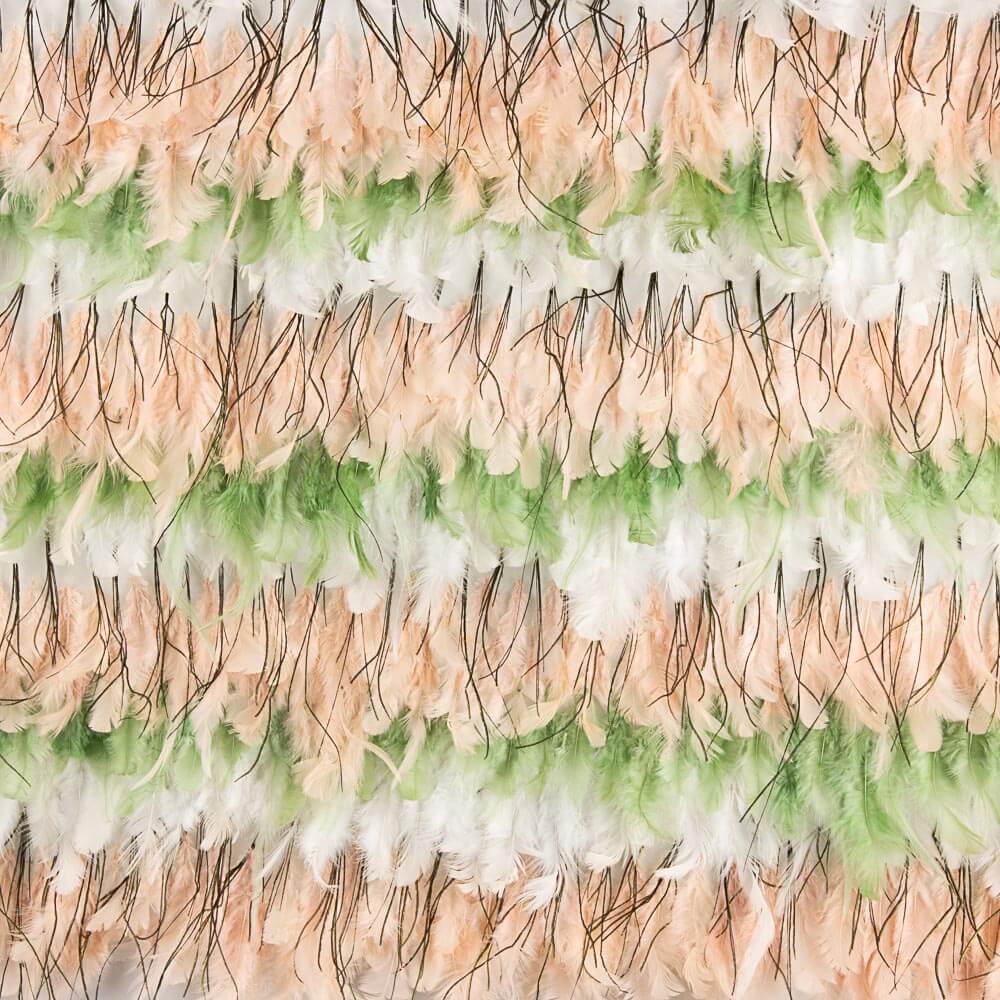 Tela de fantasía con plumas cosidas en forma de bayadera verde. Base de georgette en el mismo tono con plumas cosidas para vestidos de fiesta o accesorios de fiesta. Recomendamos tratado con tintorería.