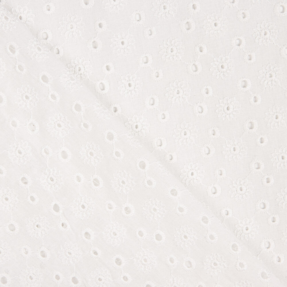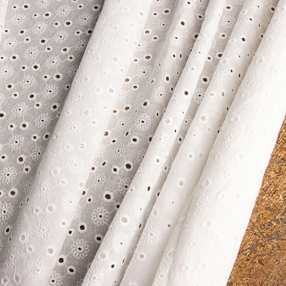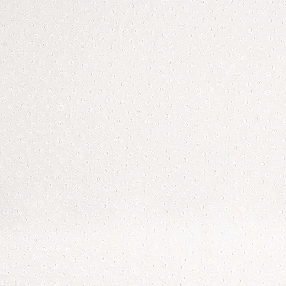 Fabric with perforated Swiss embroidery Tiny Flower. 100% cotton voile fabric in white, soft, soft, lightly supported. Embroidery of small, fine cotton Flemish openwork flowers, natural to the touch and with relief created by the embroidery itself. High quality embroidered fabric, with a subtle perforated pattern, providing a fresh and youthful play of transparencies. This fabric is perfect for sewing Sevillana dresses, appliqués and flamenco flounces. Also used for communion dresses and spring/summer fashion sew. You can use this type of Swiss Embroidery voile for your freshest creations, giving a romantic and casual air: Ibiza dresses, blouses, tops, skirts... as well as for complements and ornaments. We suggest you to combine this fantastic Tiny Flor perforated embroidery with our wide range of denim fabrics that you can see in this link.