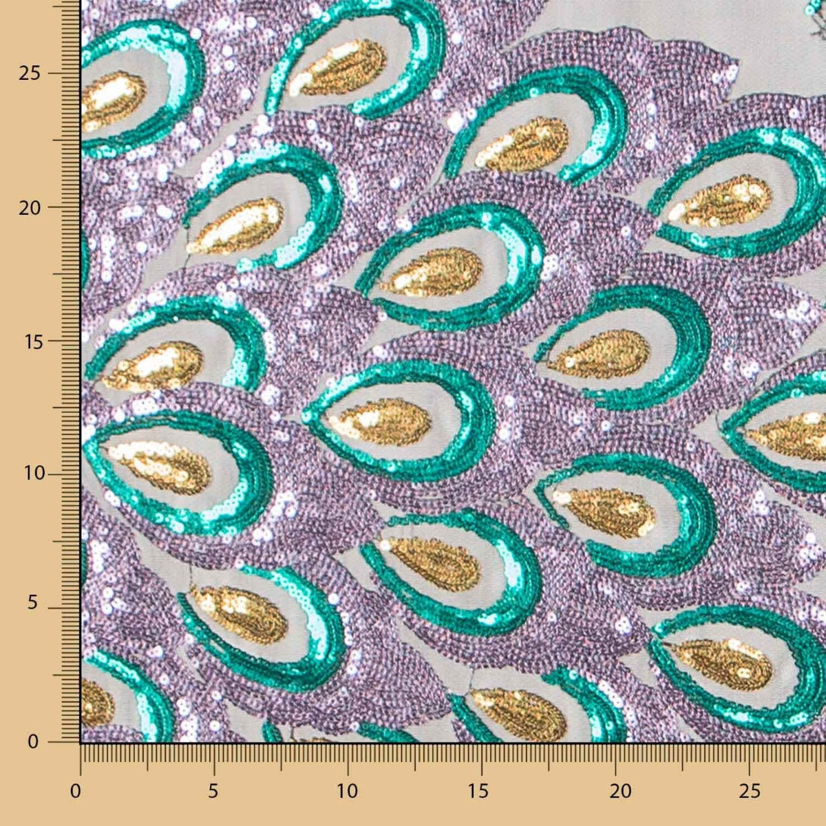 Sequined fabric with purple peacock feathers on a bright coloured tulle base.