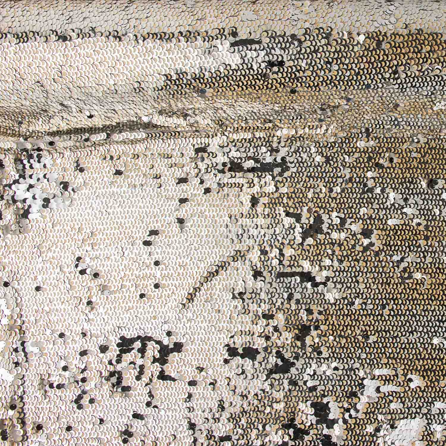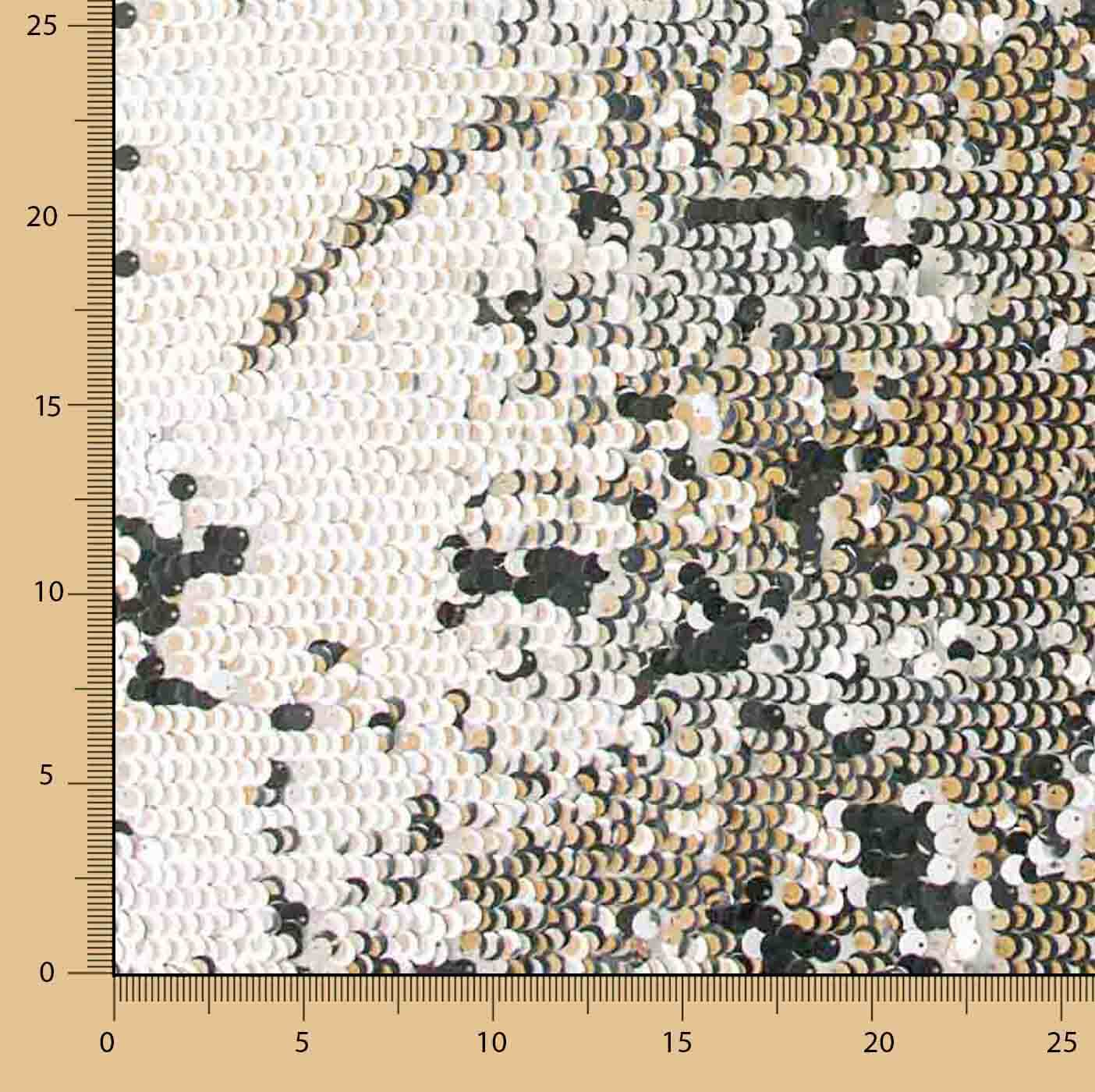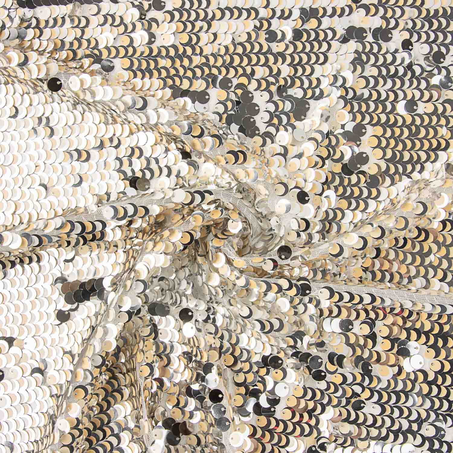 Composition: 100% polyester | Width: 115 cm | Base colour: White | Decoration: Silver and cream sequins | Use: Party and ceremony