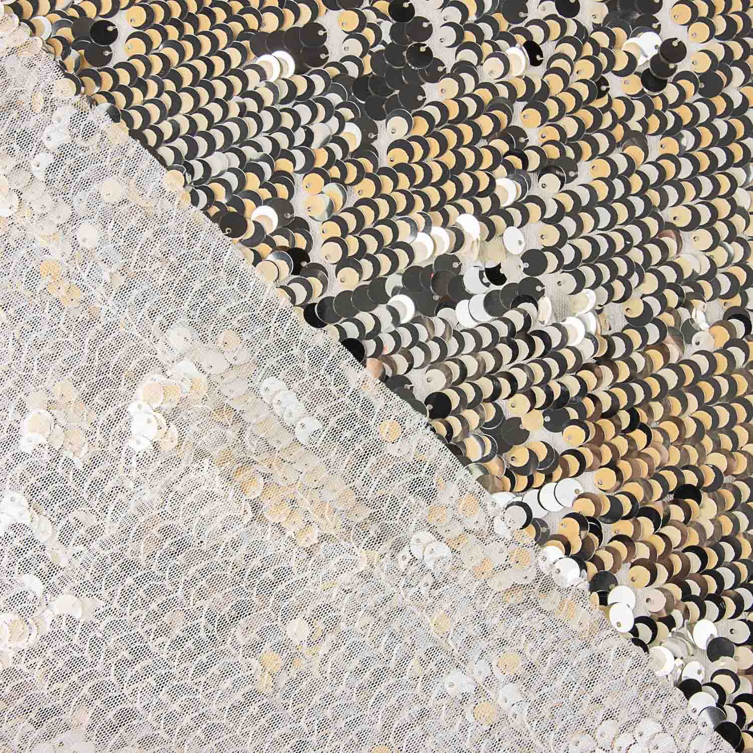 White fantasy tulle fabric with silver and cream sequins that create an elegant, luminous two-tone effect.