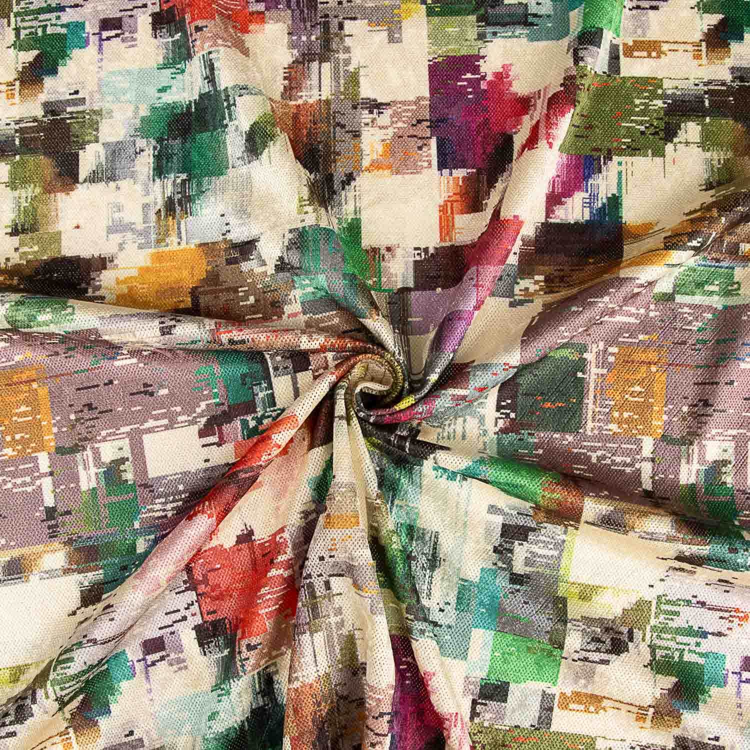 This bi-stretch velvet knit in a mosaic print combines a vibrant design with the comfort of stretch fabric. Its soft surface with a slight sheen creates a striking and elegant visual effect.